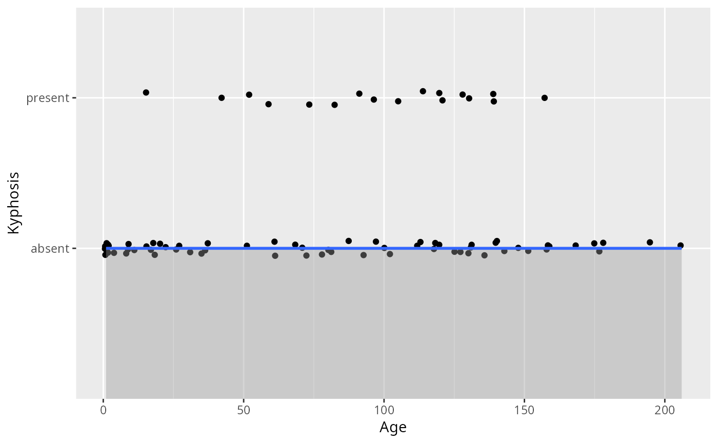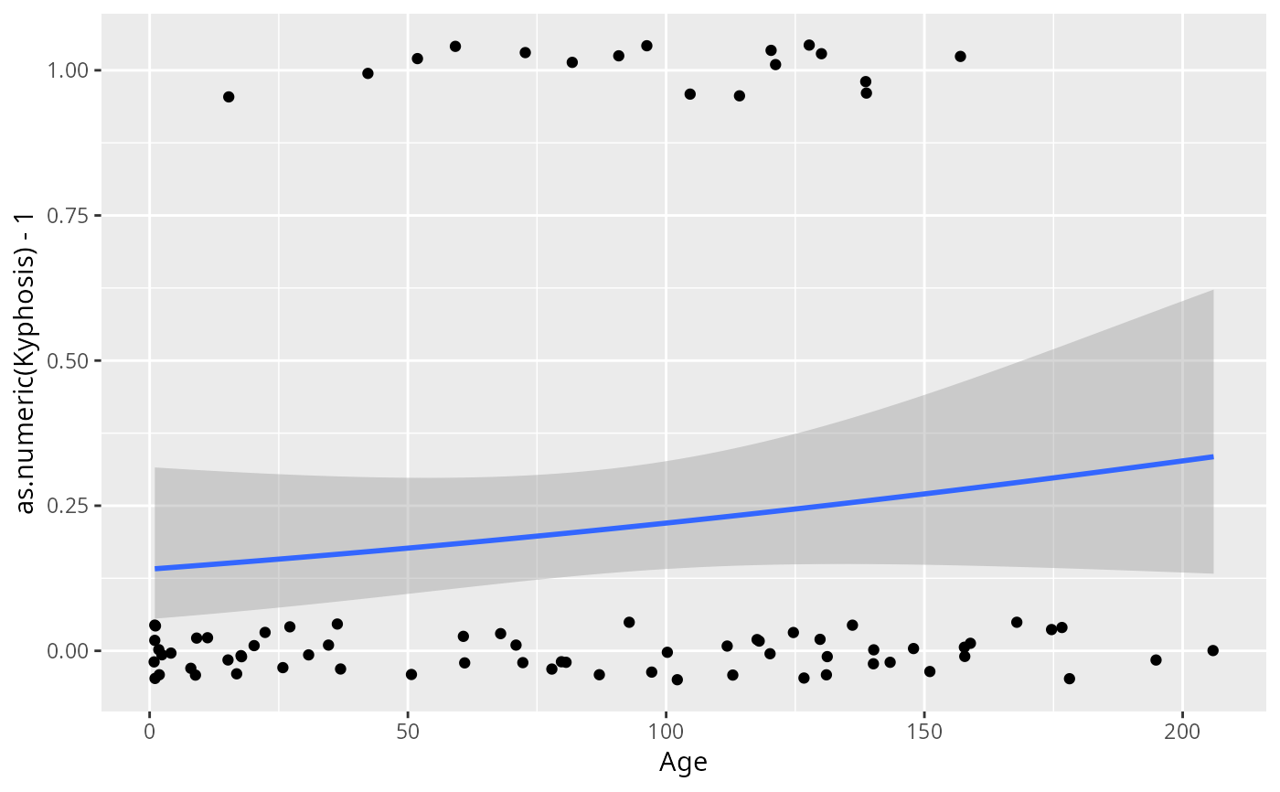 ggplot(rpart::kyphosis, aes(Age, as.numeric(Kyphosis) - 1)) +