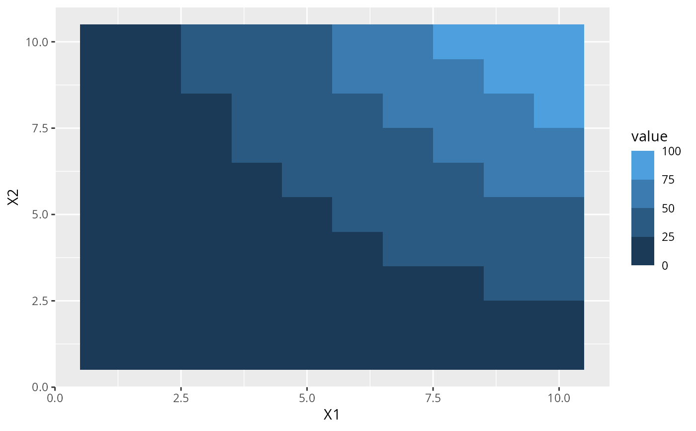 p <- ggplot(df, aes(X1, X2)) + geom_tile(aes(fill = value))