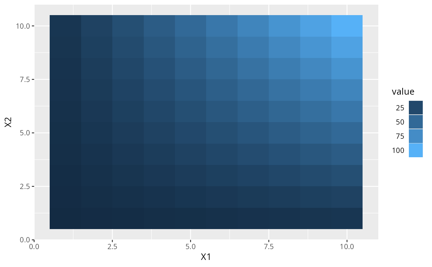 p1 <- ggplot(df, aes(X1, X2)) + geom_tile(aes(fill = value))