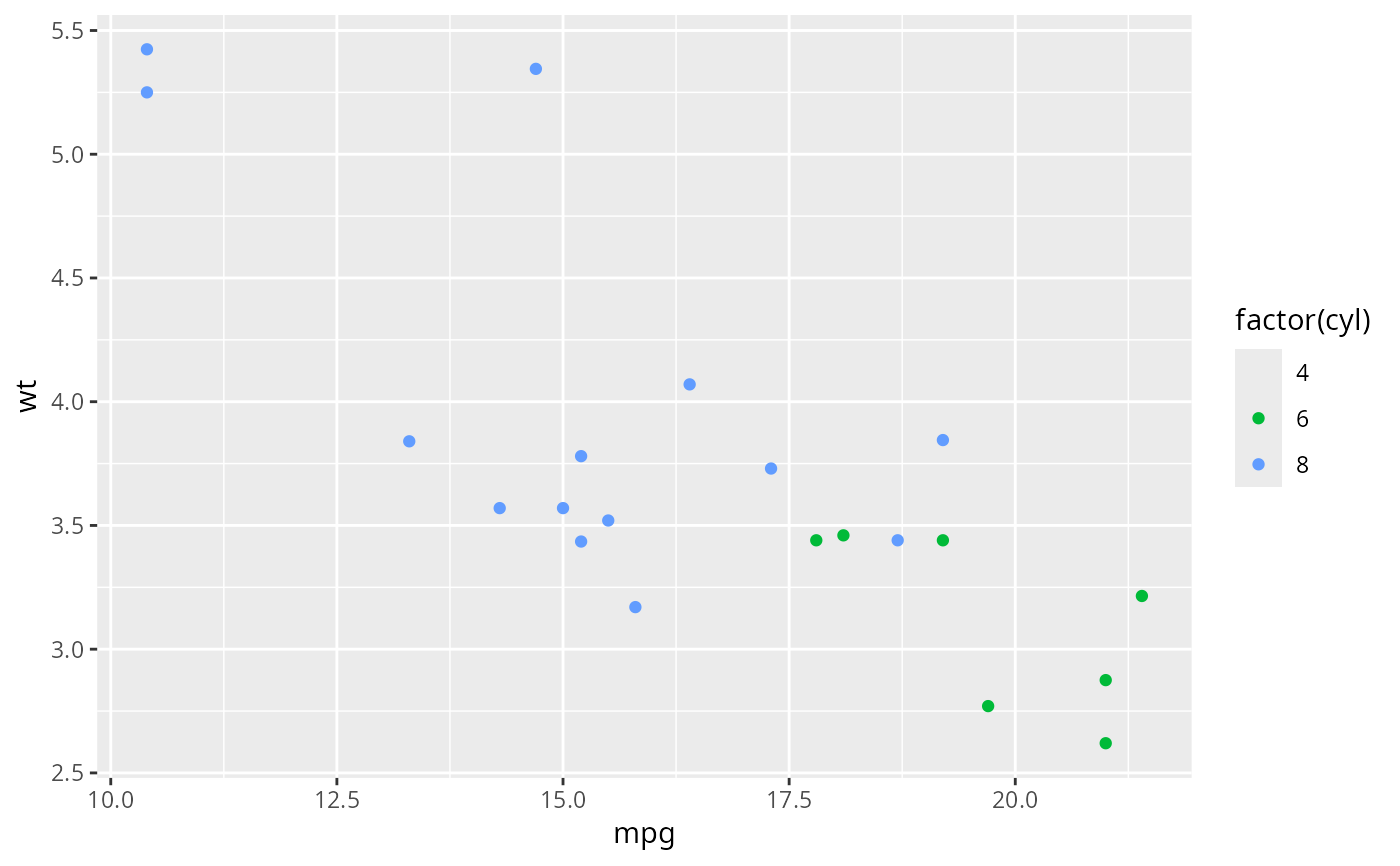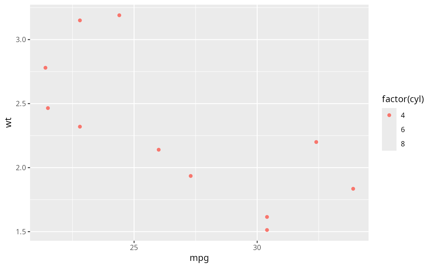 ggplot(small, aes(mpg, wt, colour = factor(cyl))) +