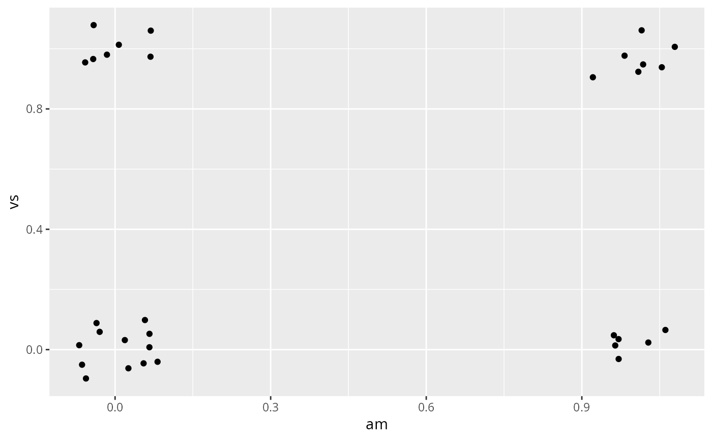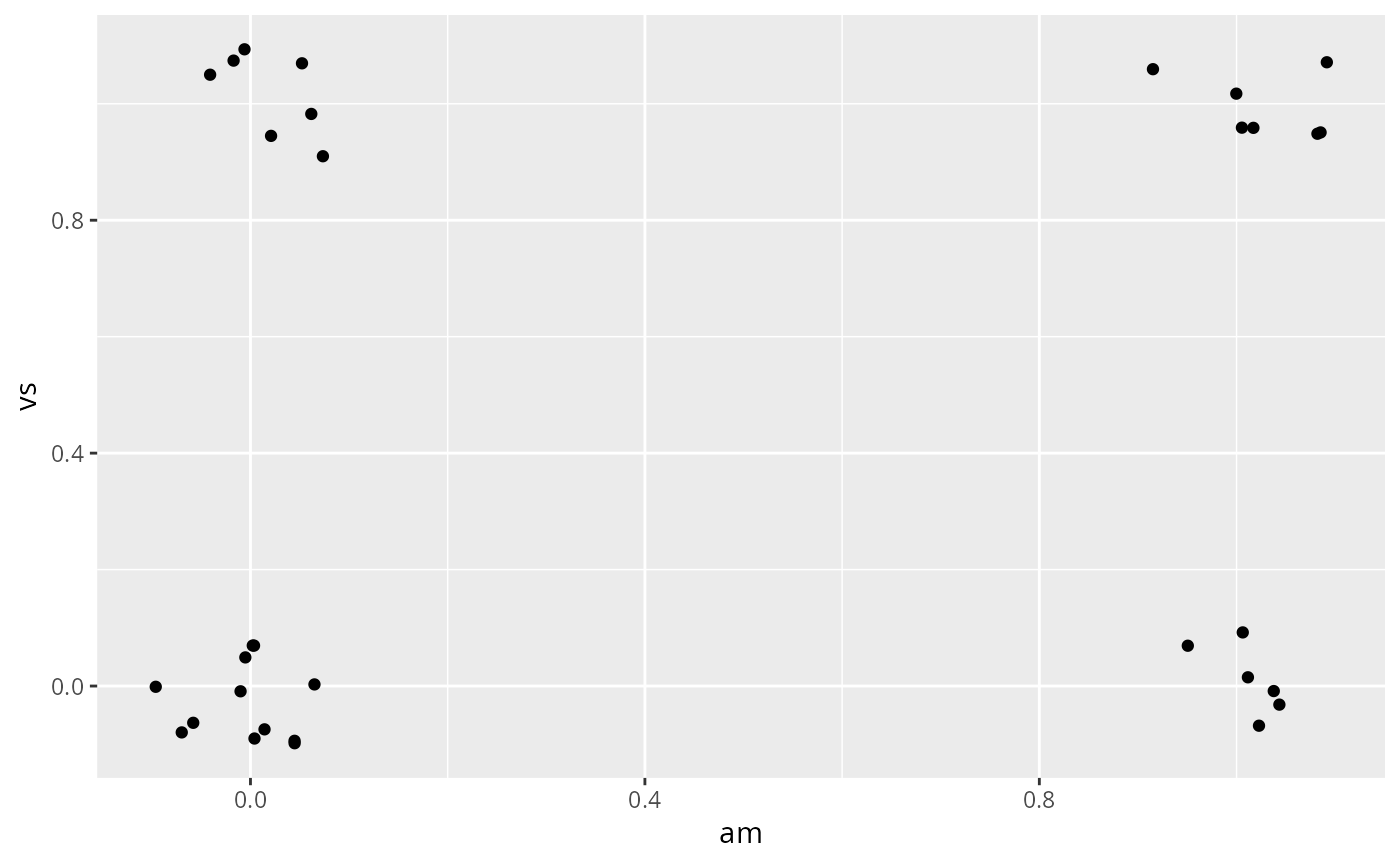 geom_point(position = jitter, color = "red", aes(am + 0.2, vs + 0.2))