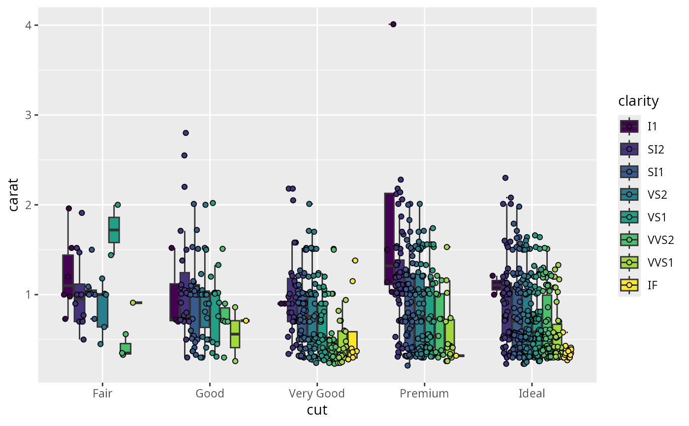 geom_point() with dodged boxplots (e.g., a geom_boxplot() with