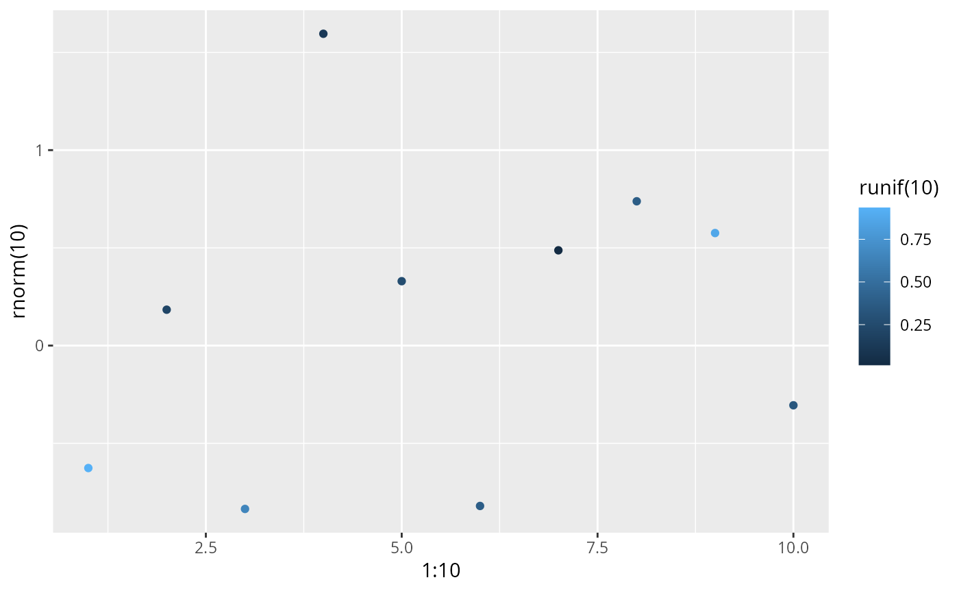qplot(1:10, rnorm(10), colour = runif(10))