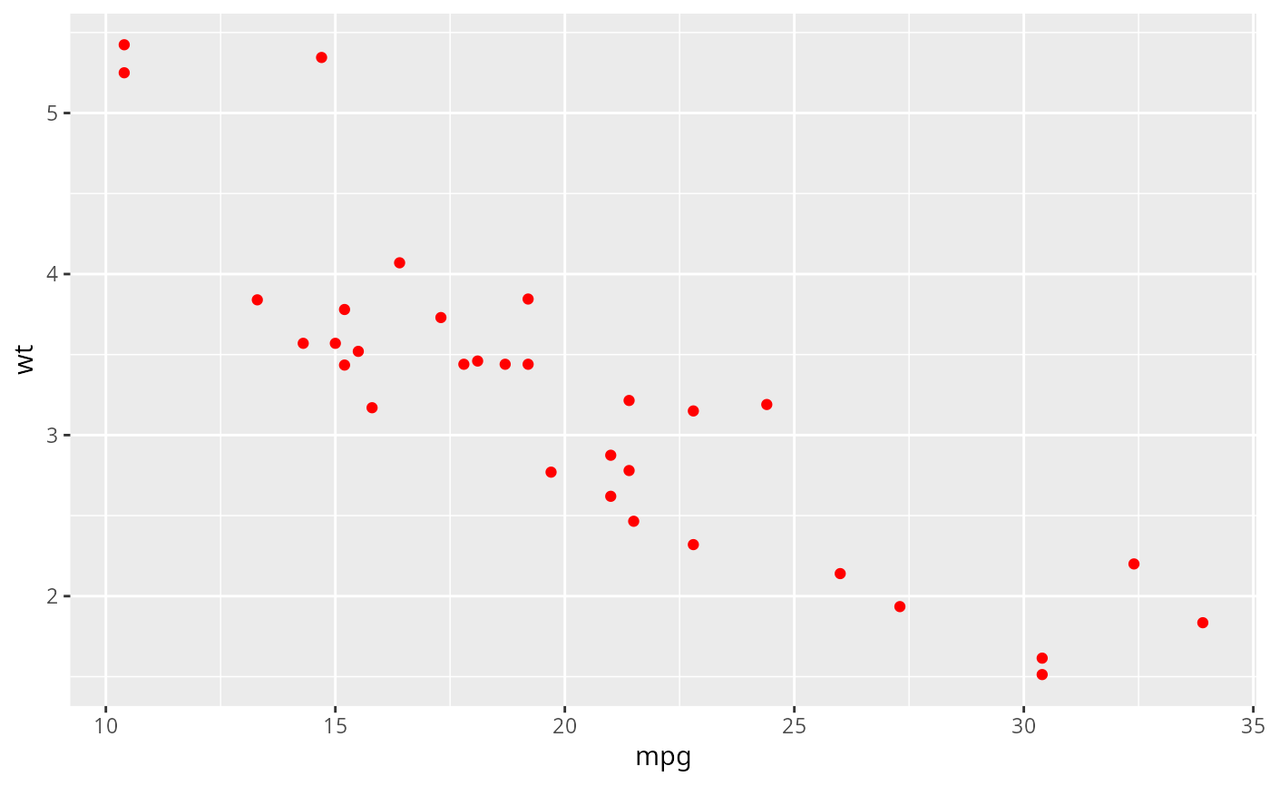 qplot(mpg, wt, data = mtcars, colour = I("red"))