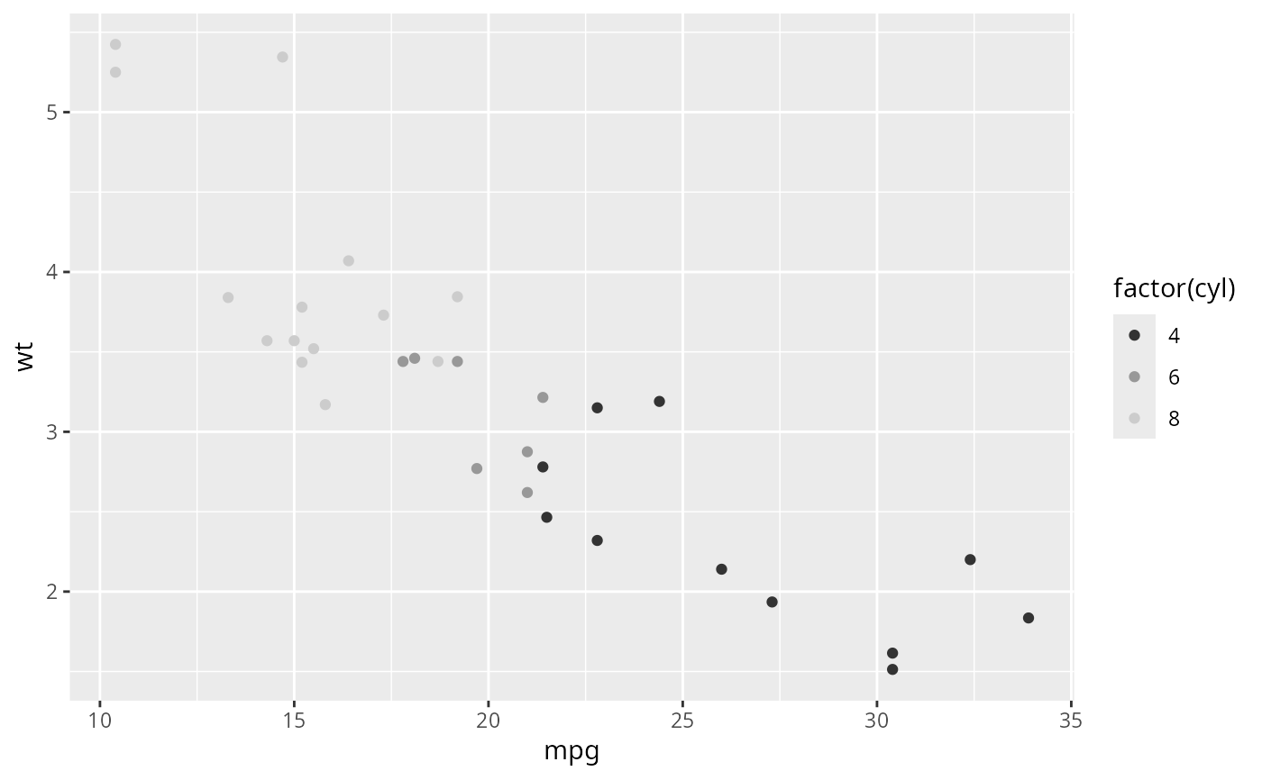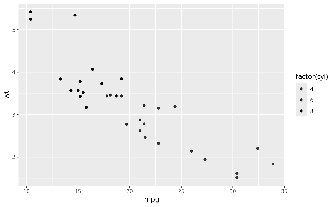 p <- ggplot(mtcars, aes(mpg, wt)) + geom_point(aes(colour = factor(cyl)))