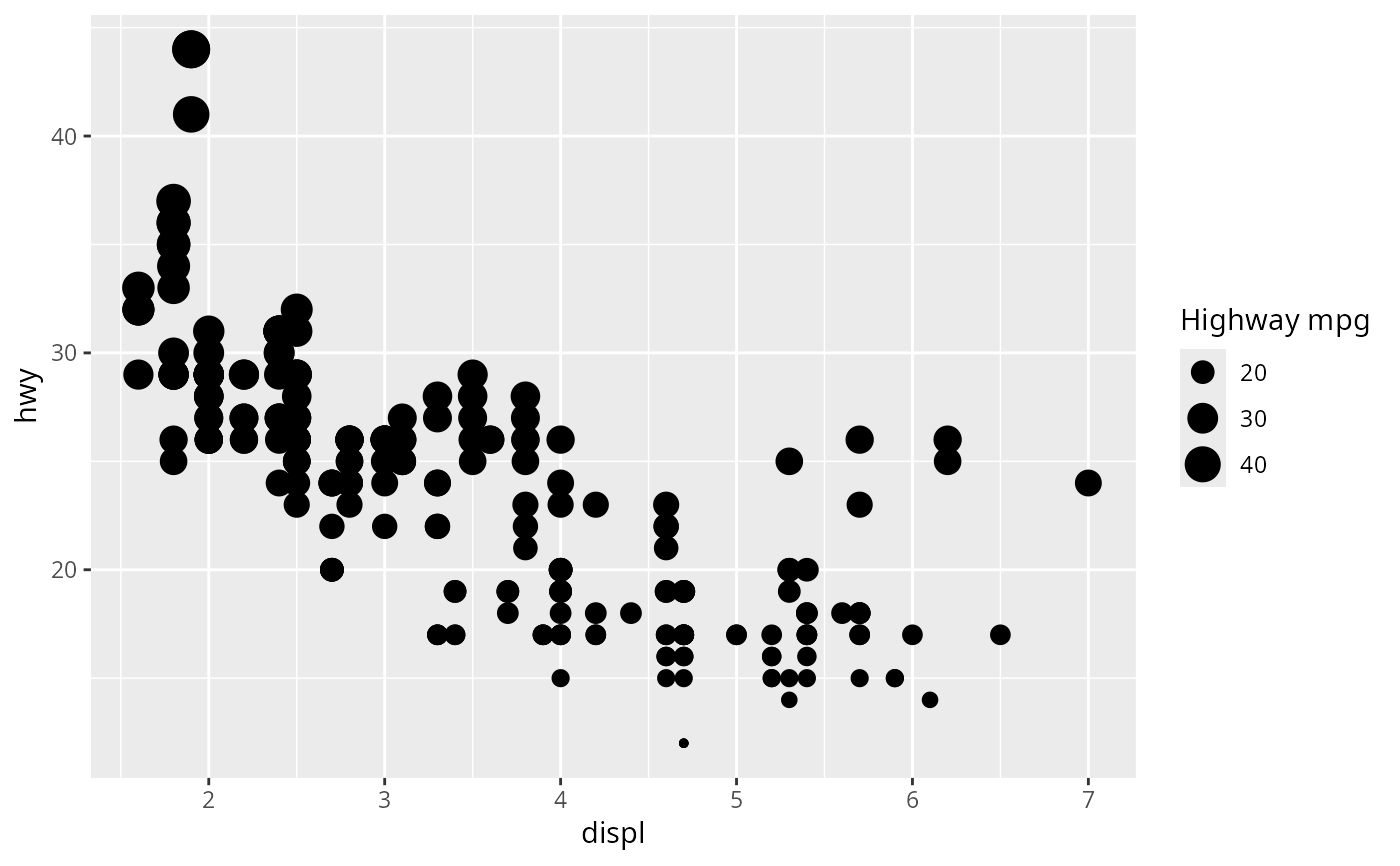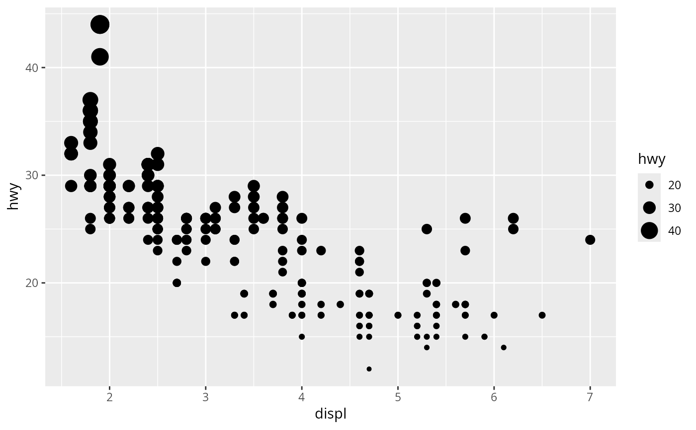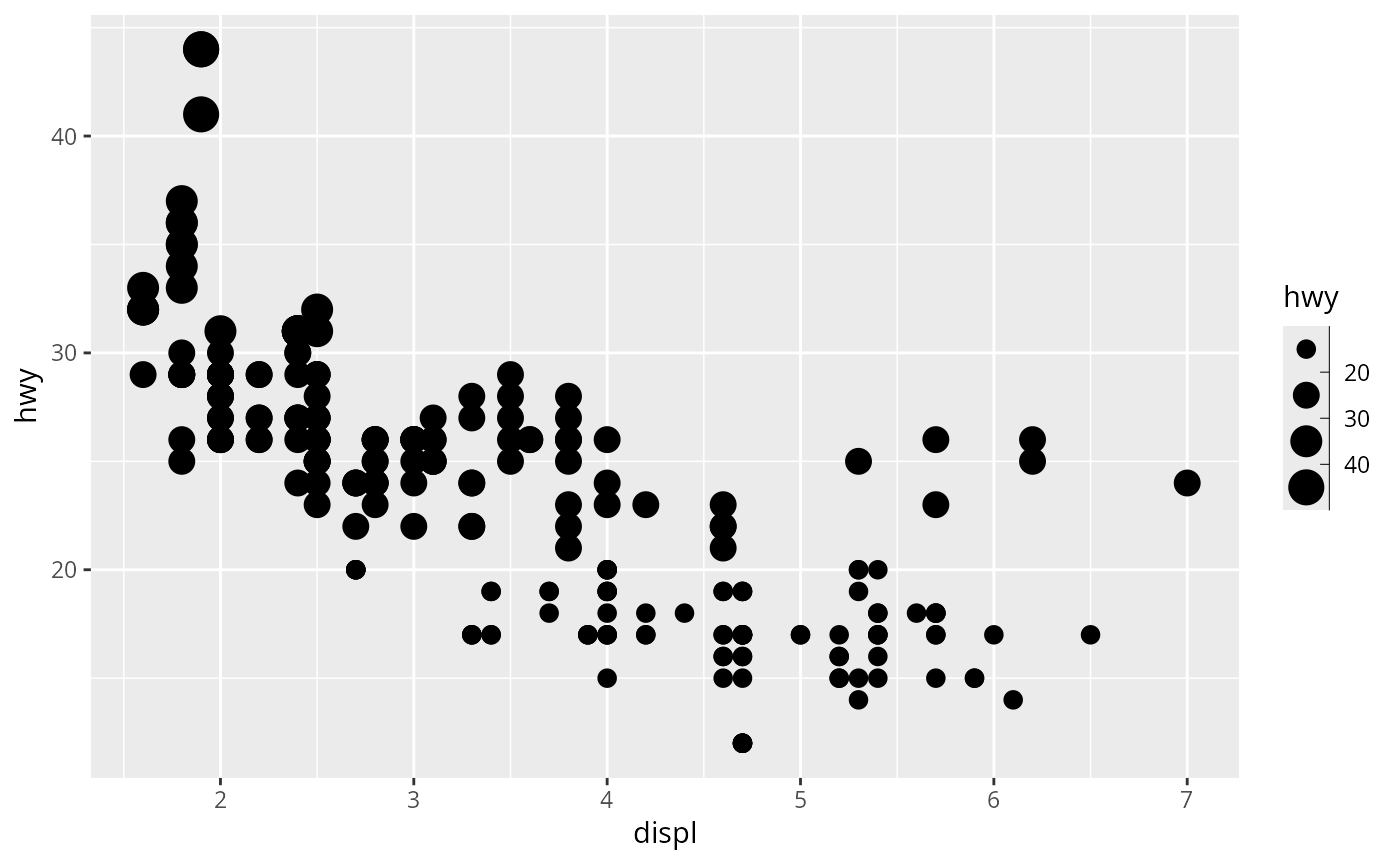 p <- ggplot(mpg, aes(displ, hwy, size = hwy)) +