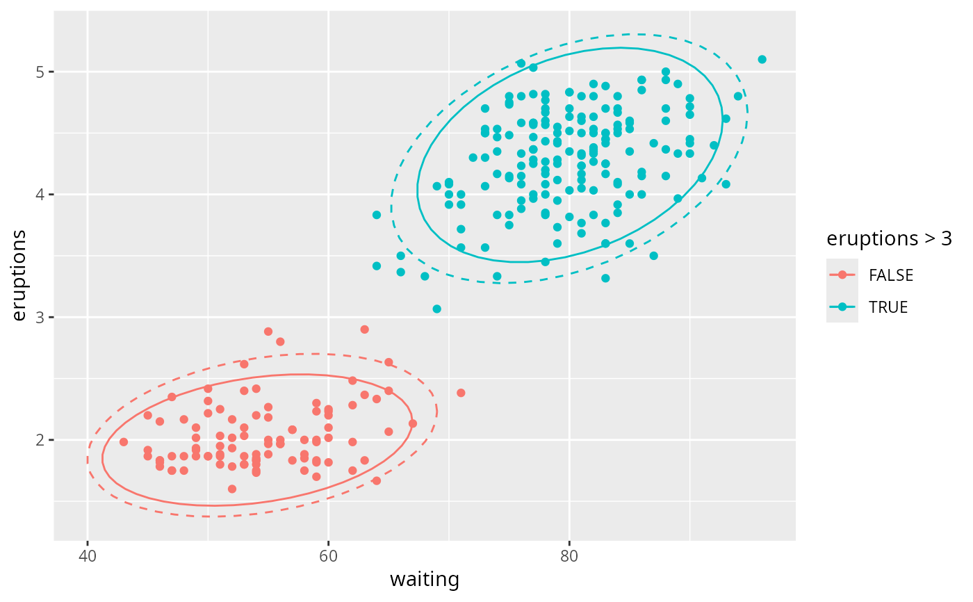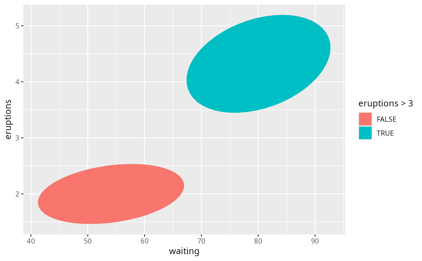 ggplot(faithful, aes(waiting, eruptions, fill = eruptions > 3)) +