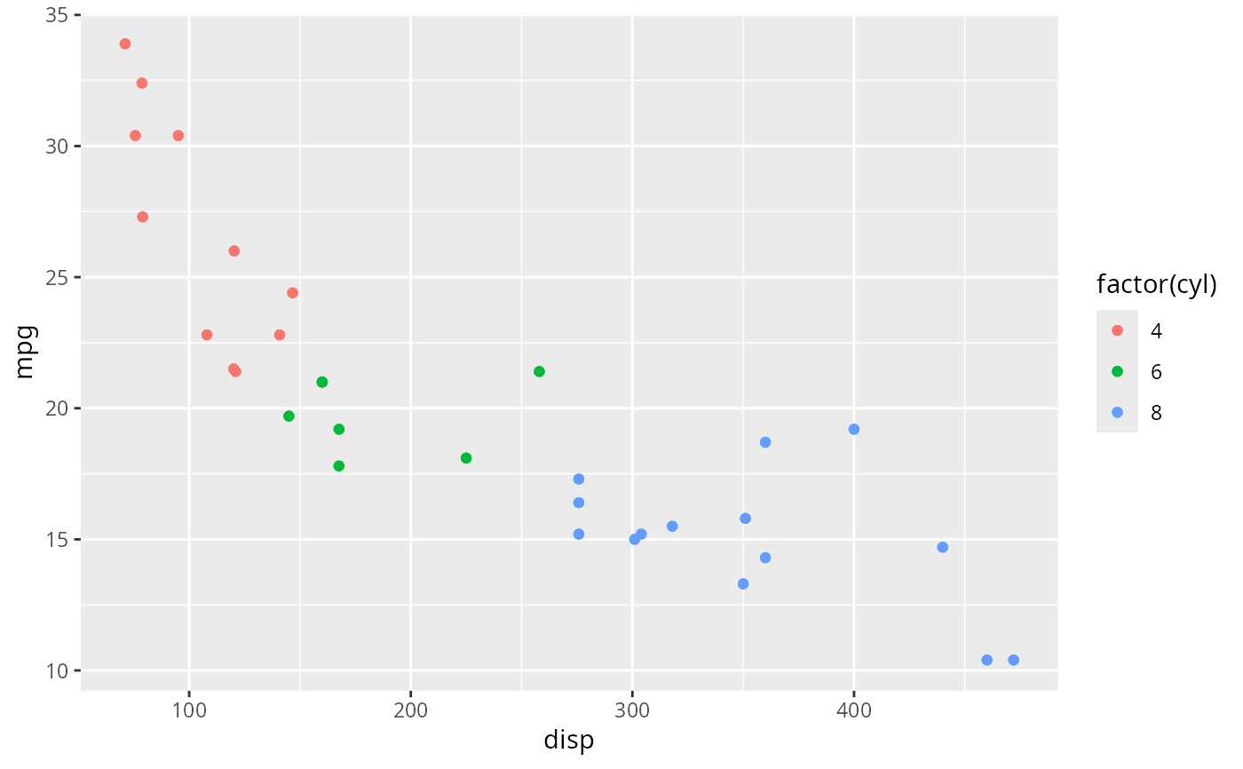p <- ggplot(mtcars, aes(disp, mpg, colour = factor(cyl))) +