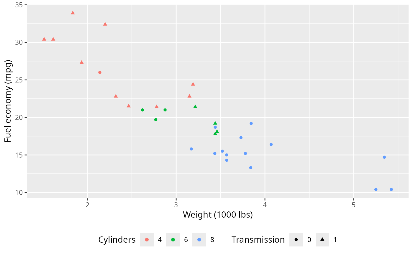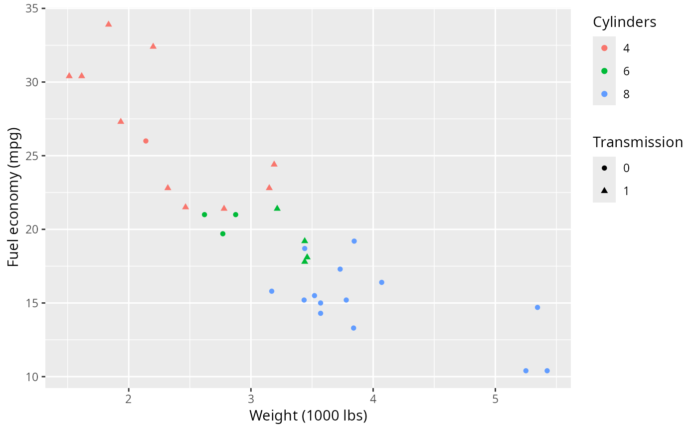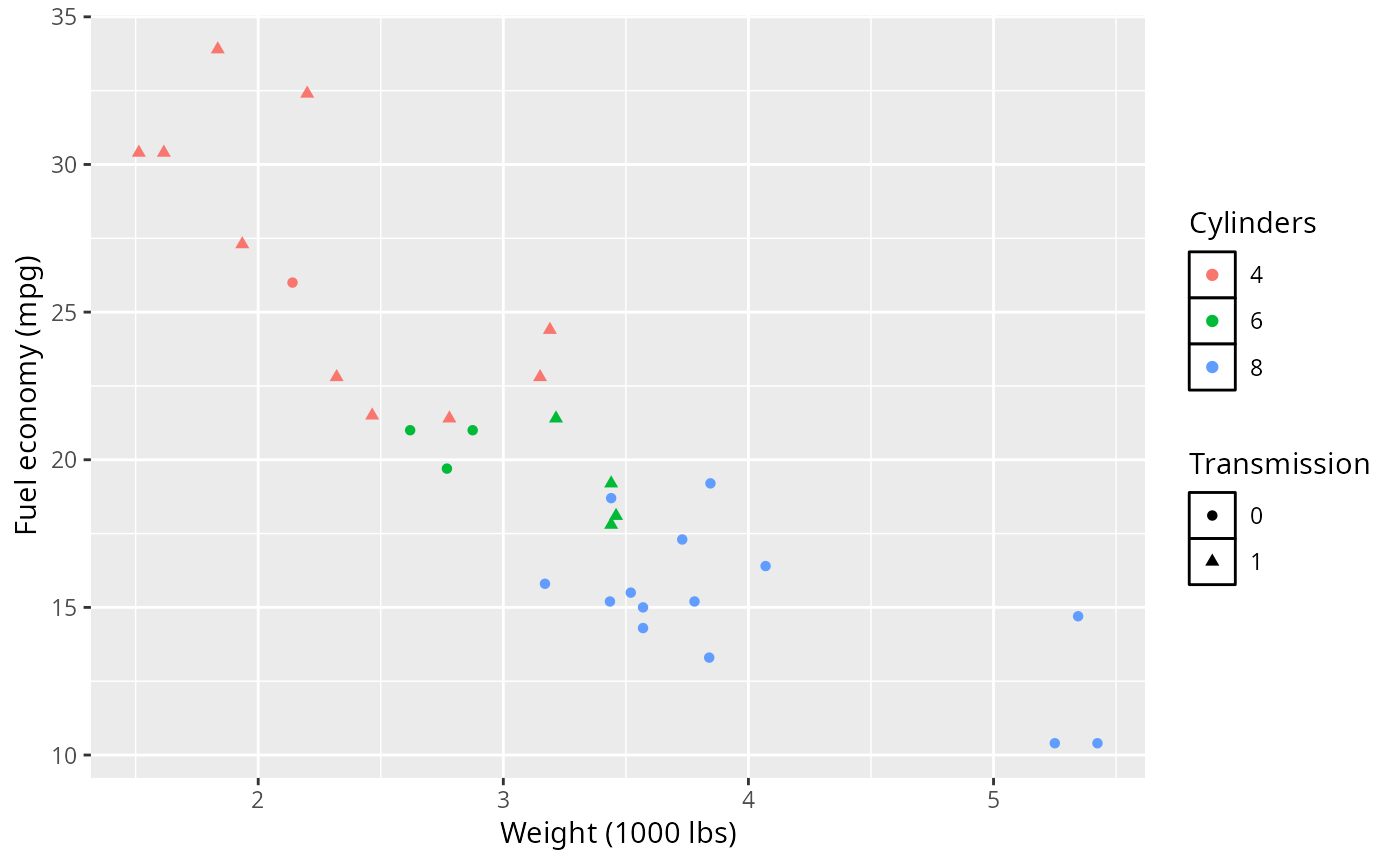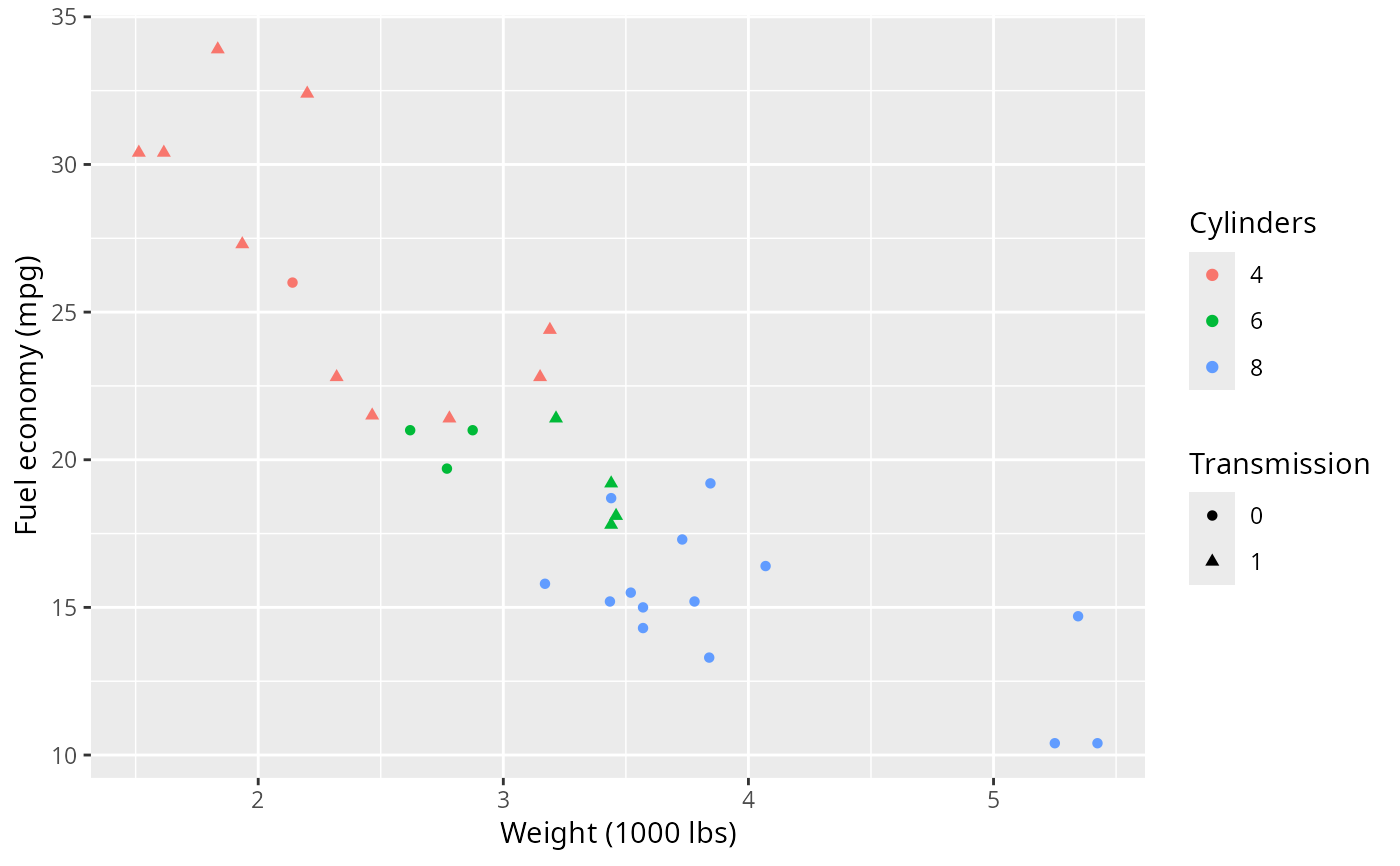 geom_point(aes(colour = factor(cyl), shape = factor(vs))) +