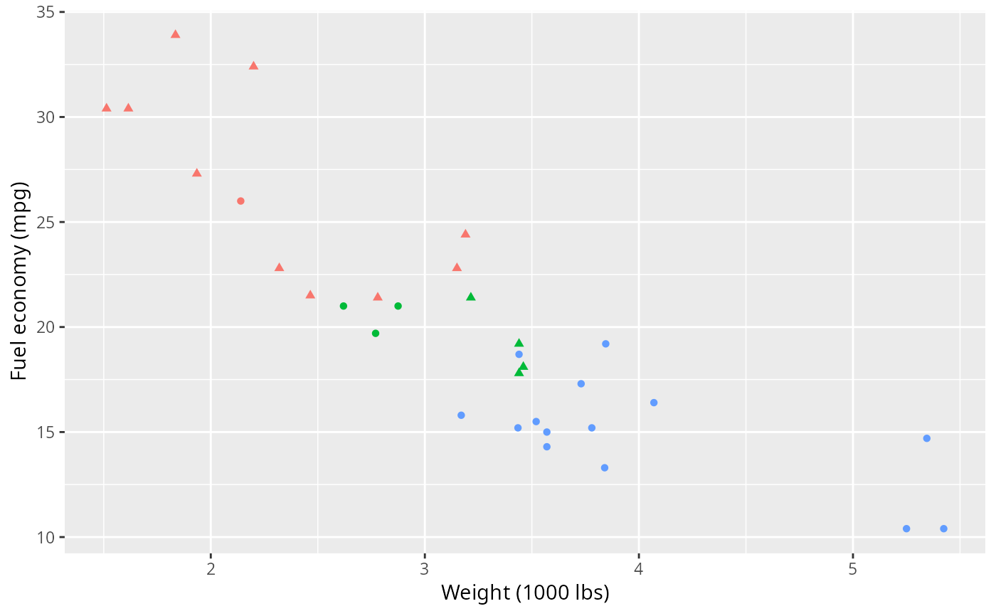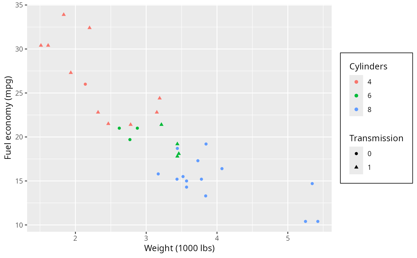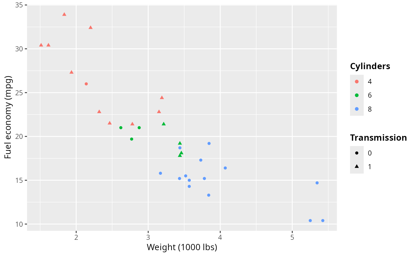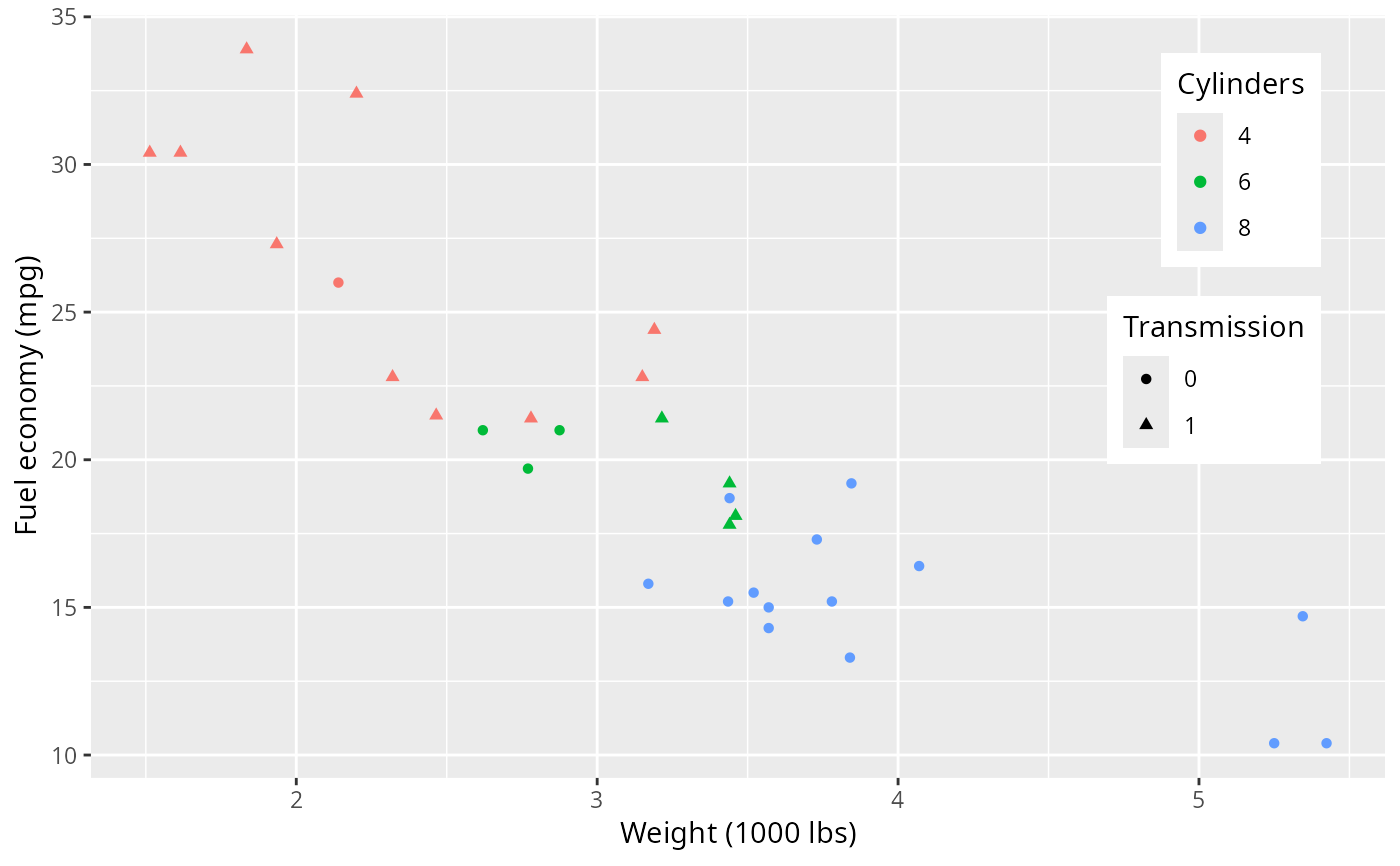 geom_point(aes(colour = factor(cyl), shape = factor(vs))) +
