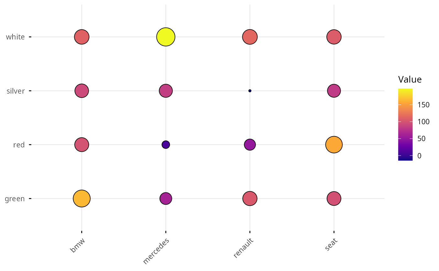 ggballoonplot(car_data, x = "Car", y = "Color",