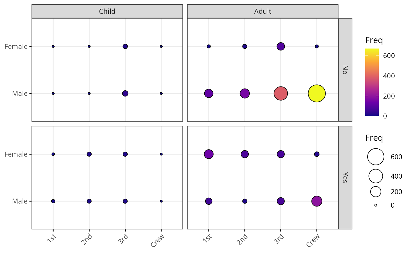 Plot a graphical matrix where each cell contains a dot whose size reflects the relative magnitude of the corresponding component. Useful to visualize contingency table formed by two categorical variables.