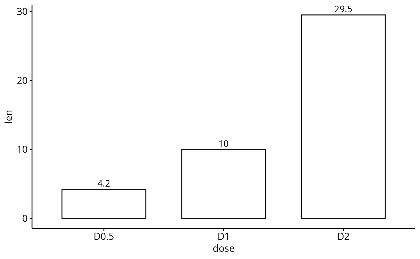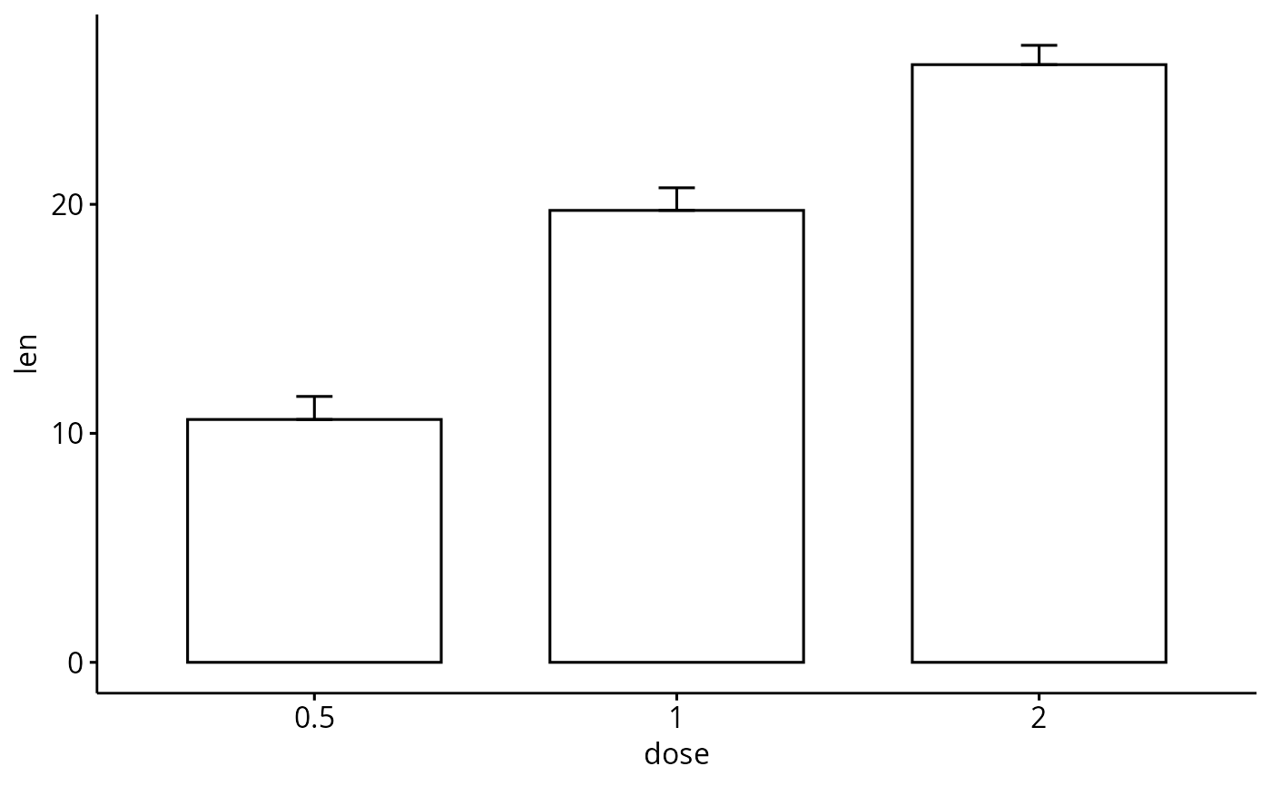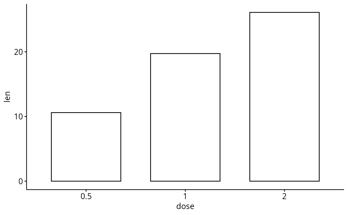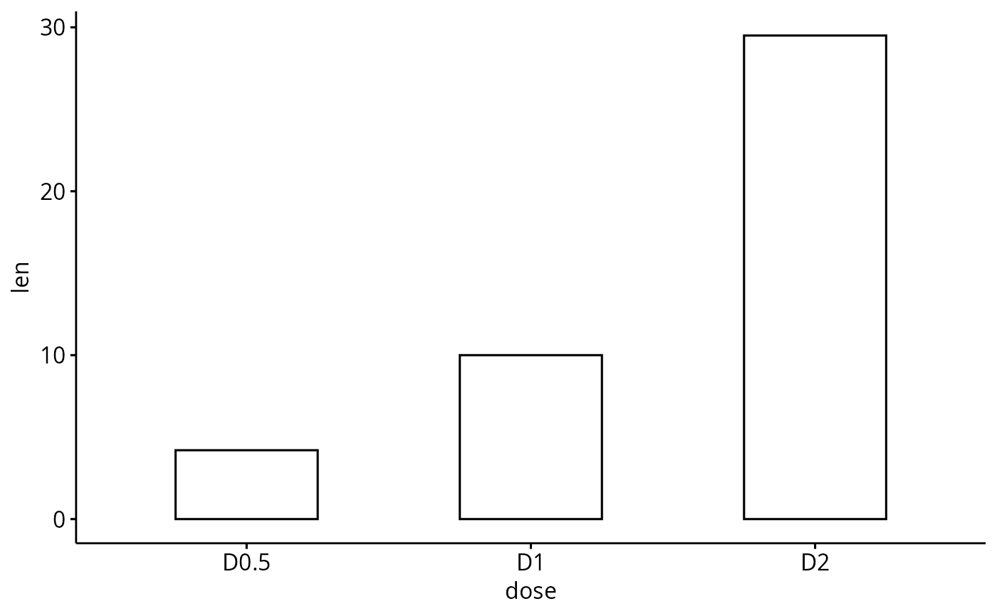ggbarplot(df, x = "dose", y = "len", width = 0.5)
