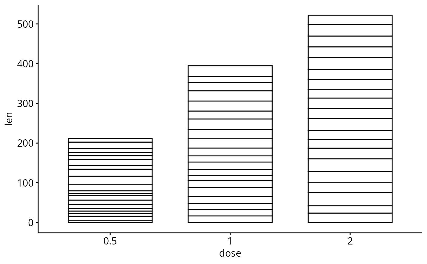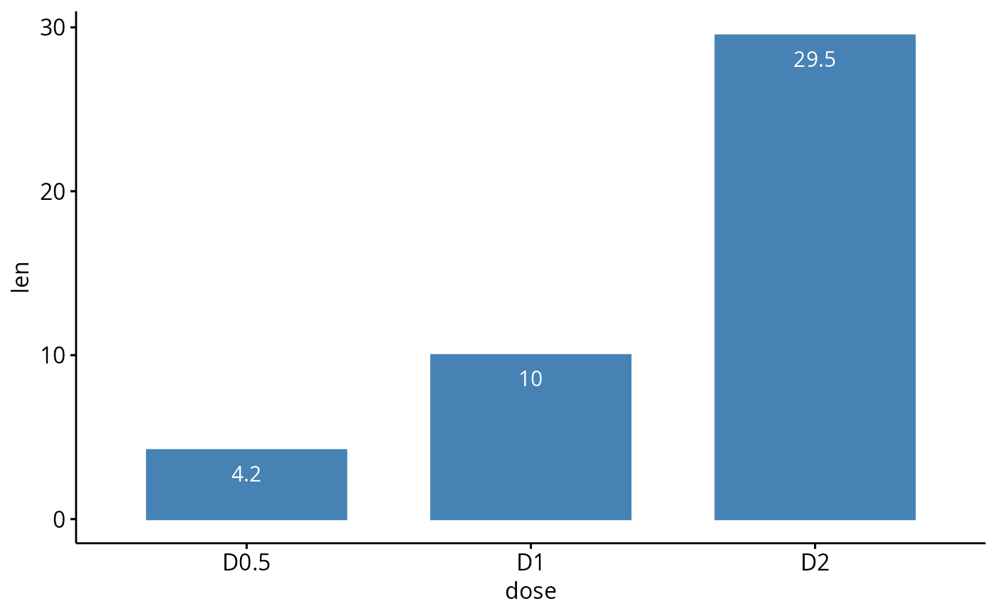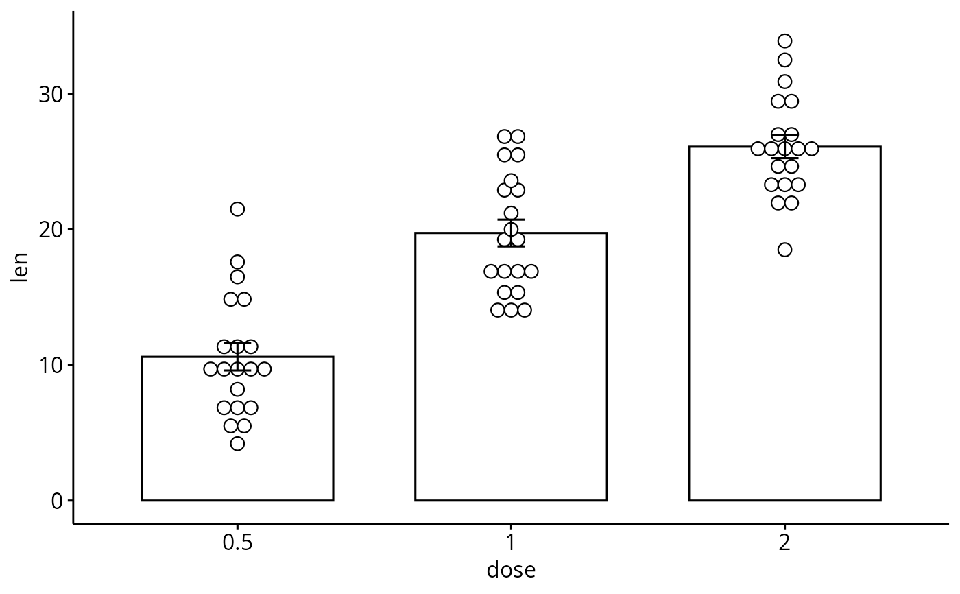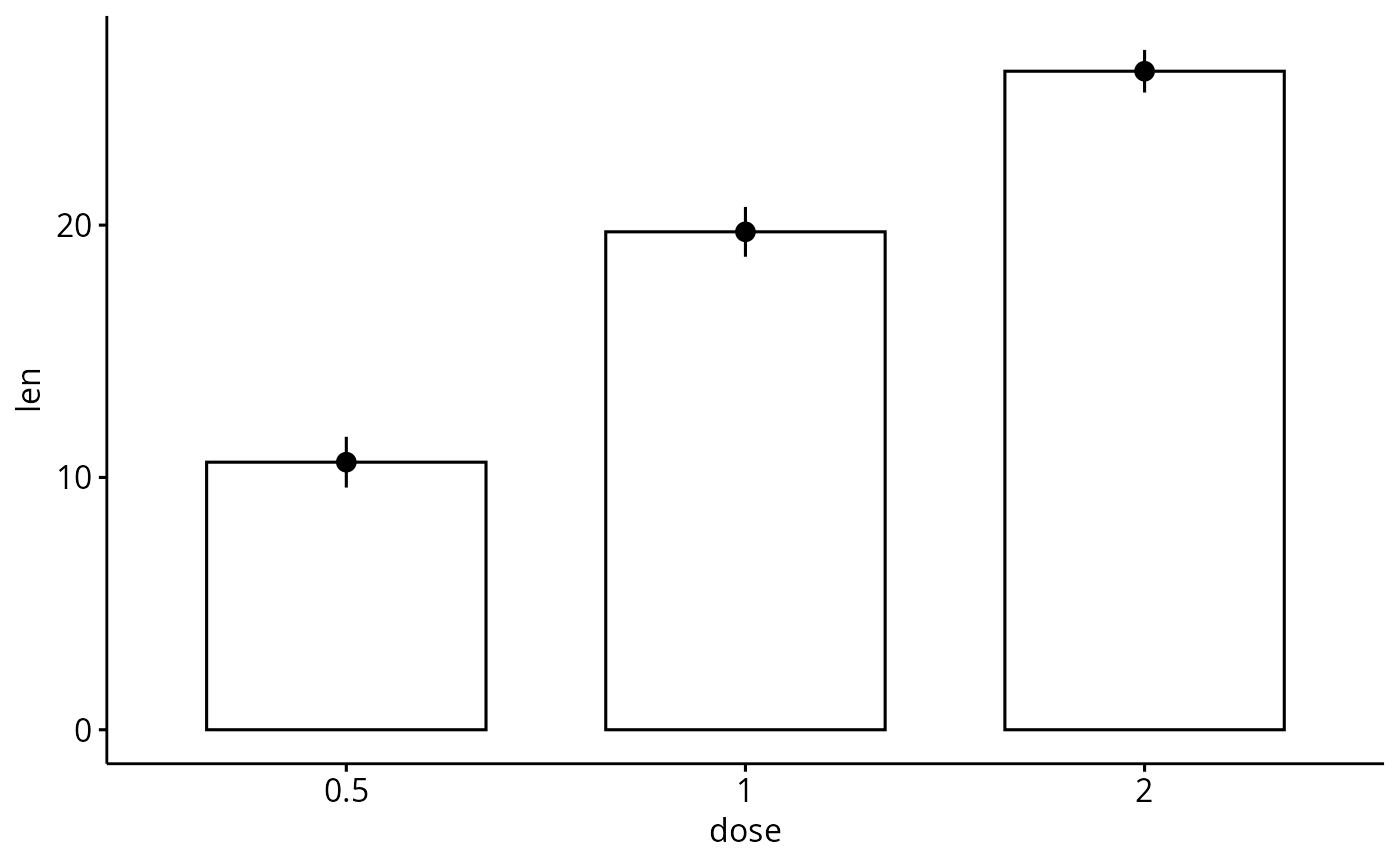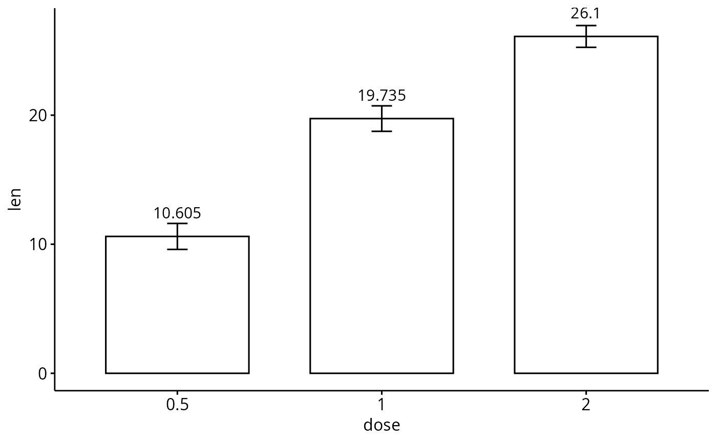 ggbarplot(df, x = "dose", y = "len", width = 0.5)