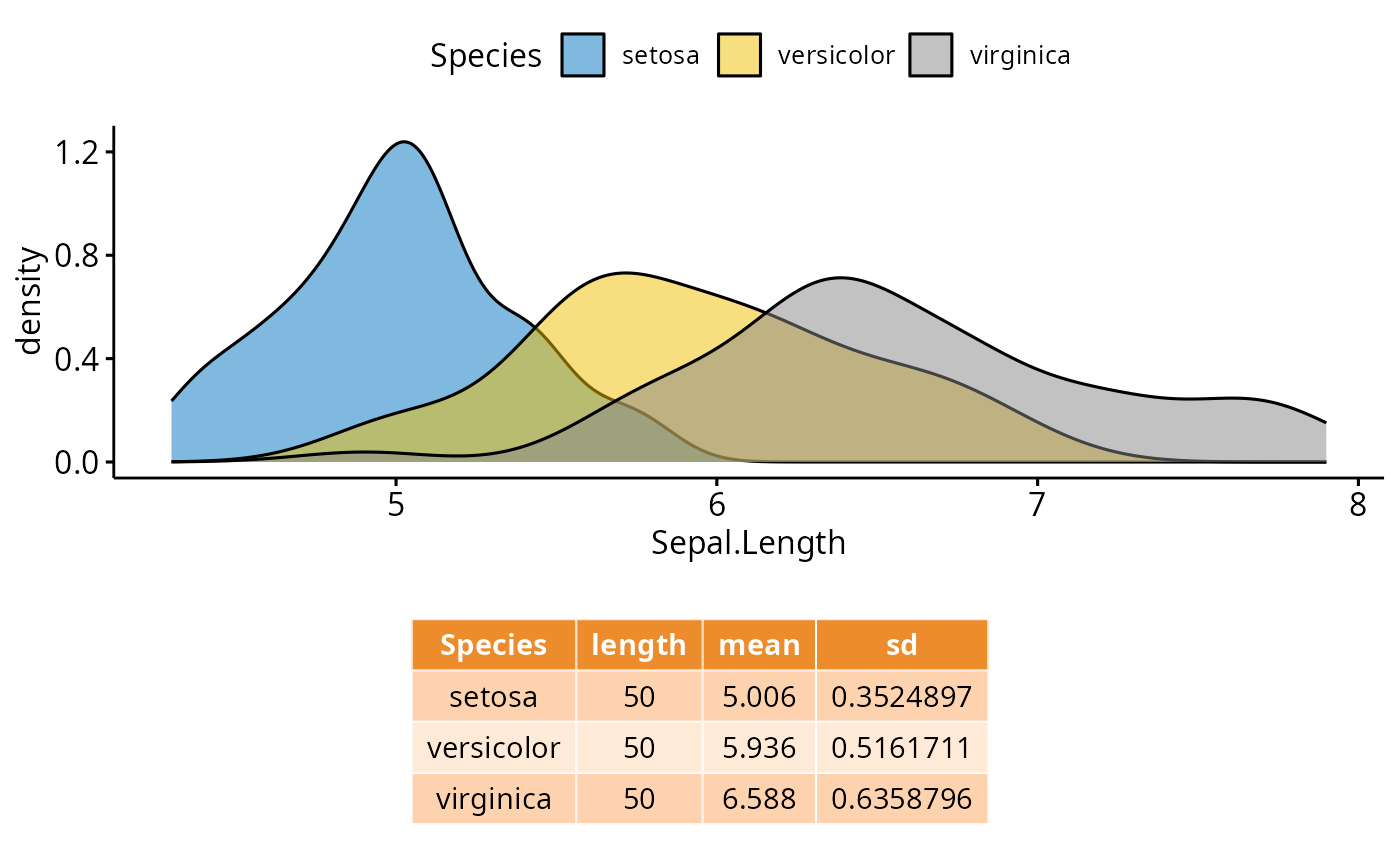 # Combine density plot and summary table
