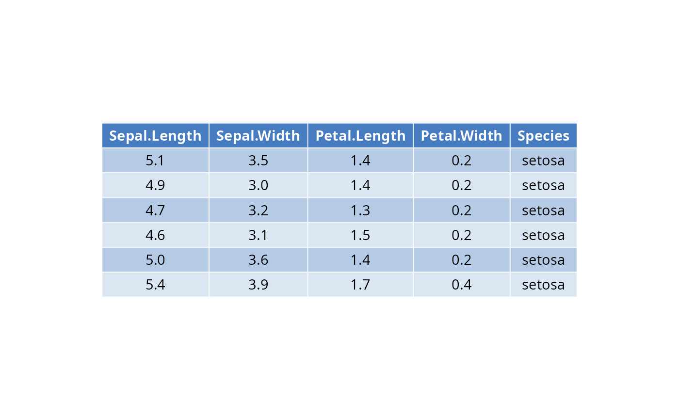 ggtexttable(df, rows = NULL, theme = ttheme("mBlue"))