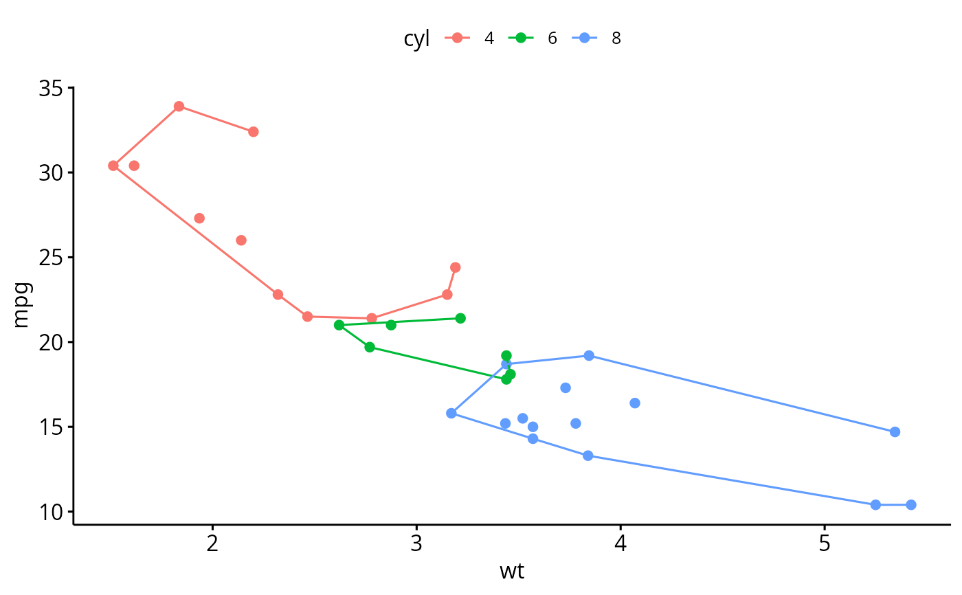 stat_chull(aes(color = cyl, fill = cyl), alpha = 0.1, geom = "polygon")