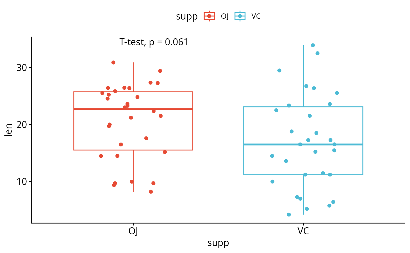 p <- ggboxplot(ToothGrowth, x = "supp", y = "len",