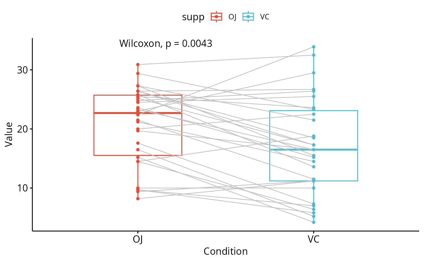 ggpaired(ToothGrowth, x = "supp", y = "len",