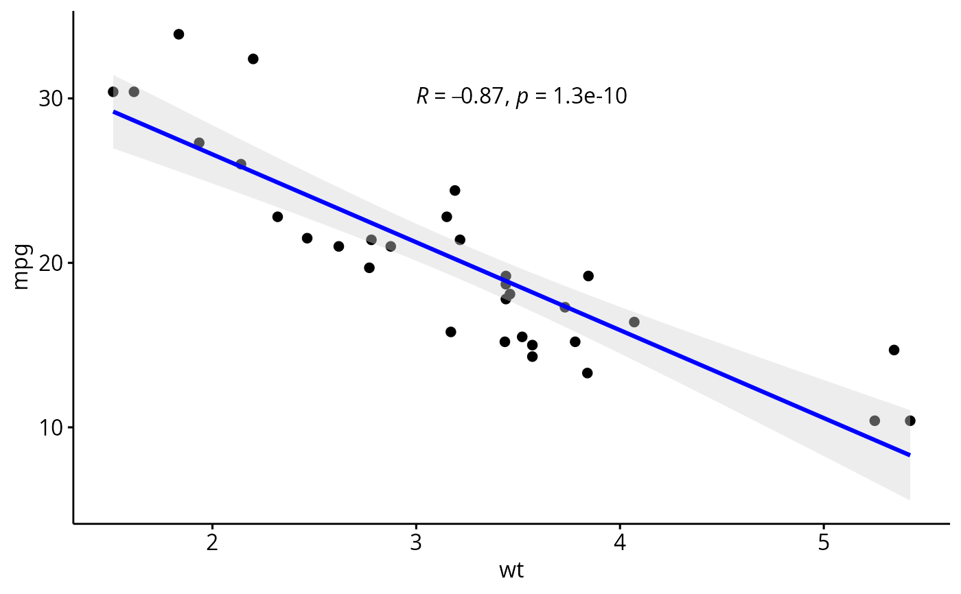 Add correlation coefficients with p-values to a scatter plot. Can be also used to add `R2`.