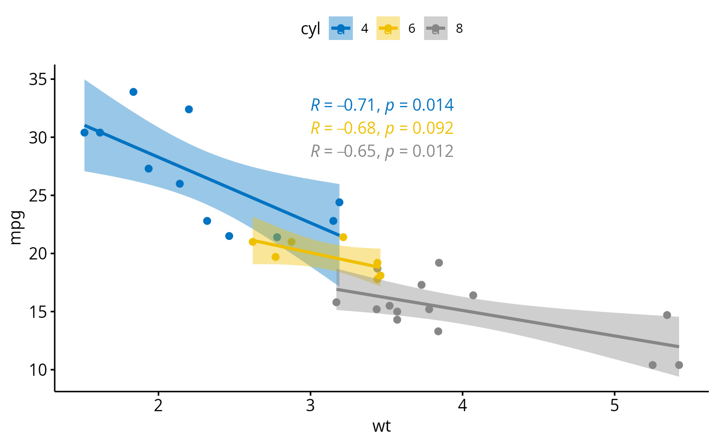 sp + stat_cor(aes(color = cyl), label.x = 3)