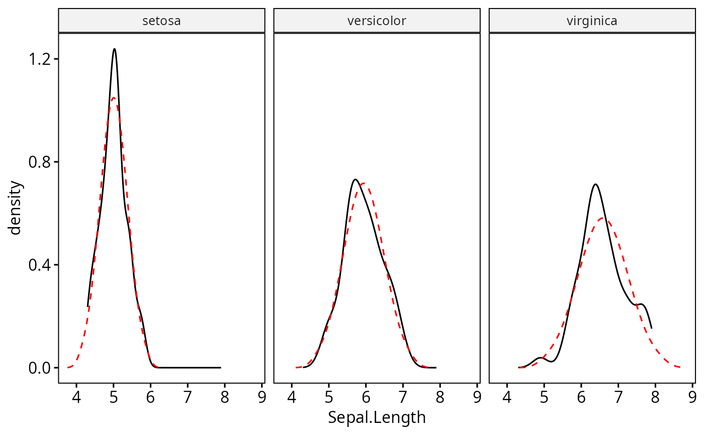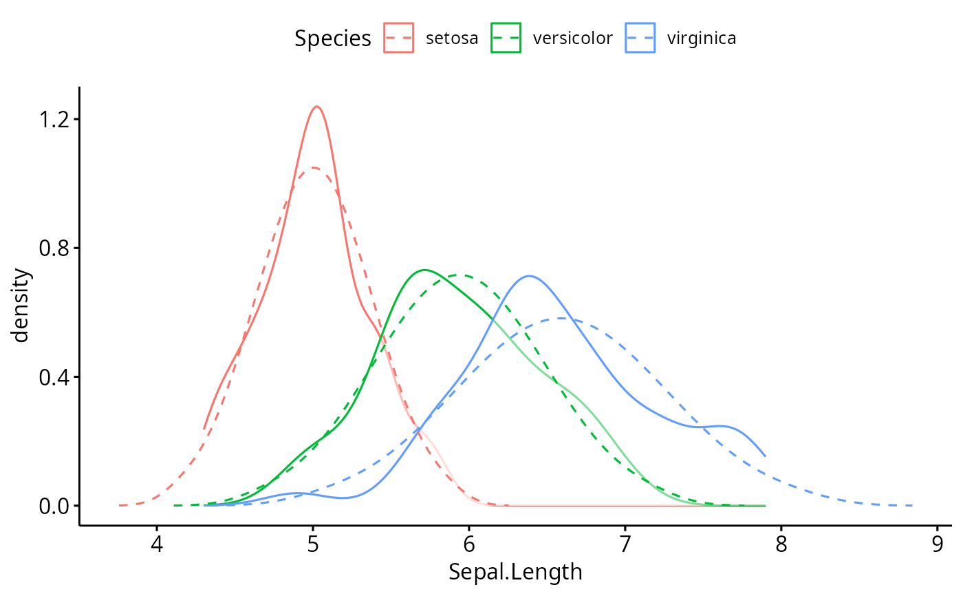 stat_overlay_normal_density(aes(color = Species), linetype = "dashed")
