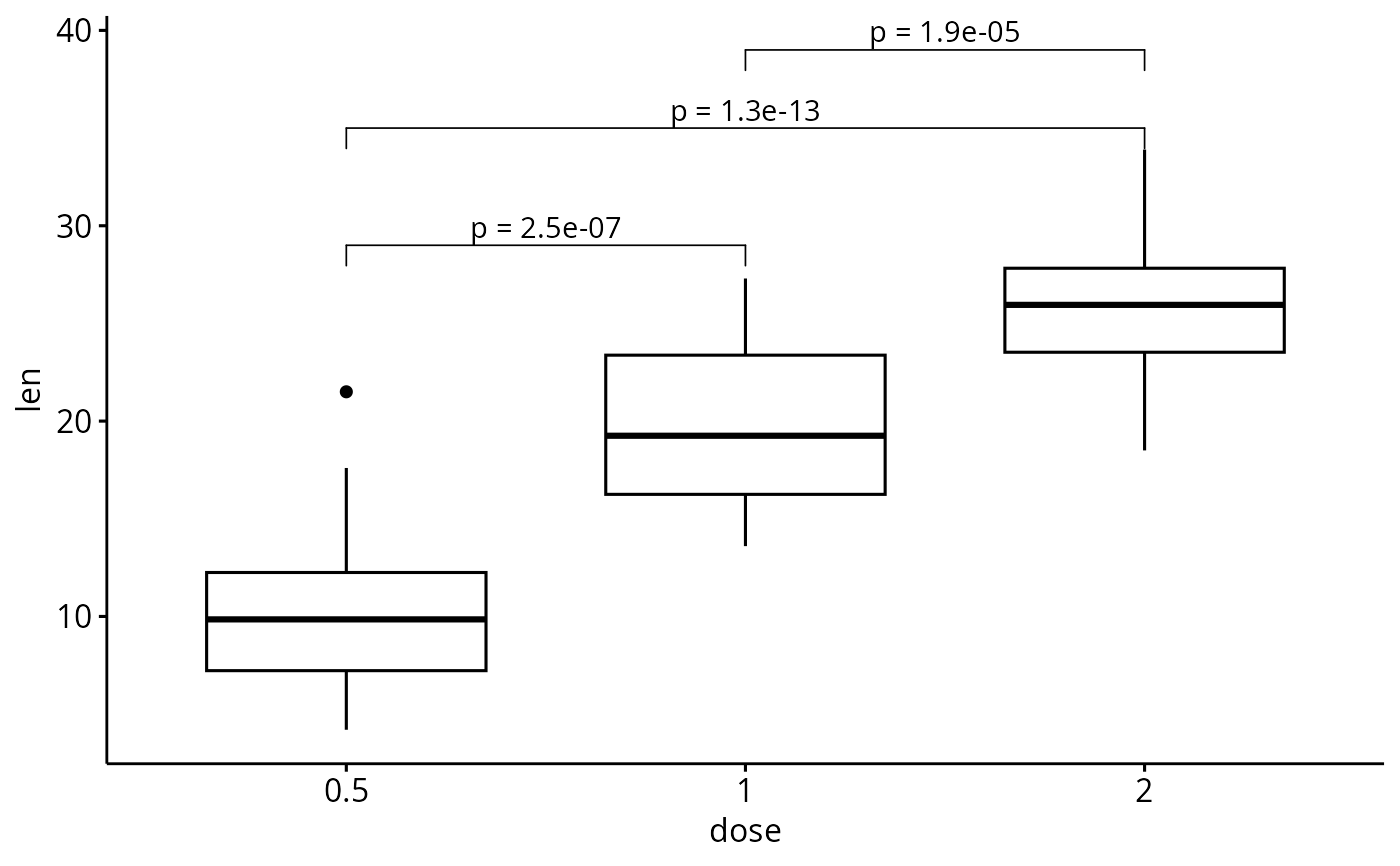 #> 1 len 0.5 1 1.27e- 7 2.5e- 7 1.3e-07 **** T-test