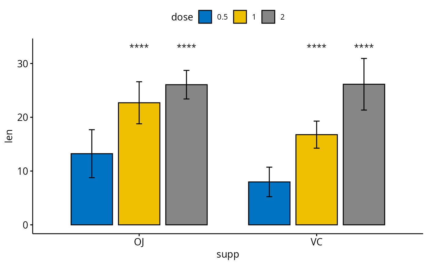 #> 1 VC len 0.5 1 0.000000681 0.000002 6.8e-07 **** T-test