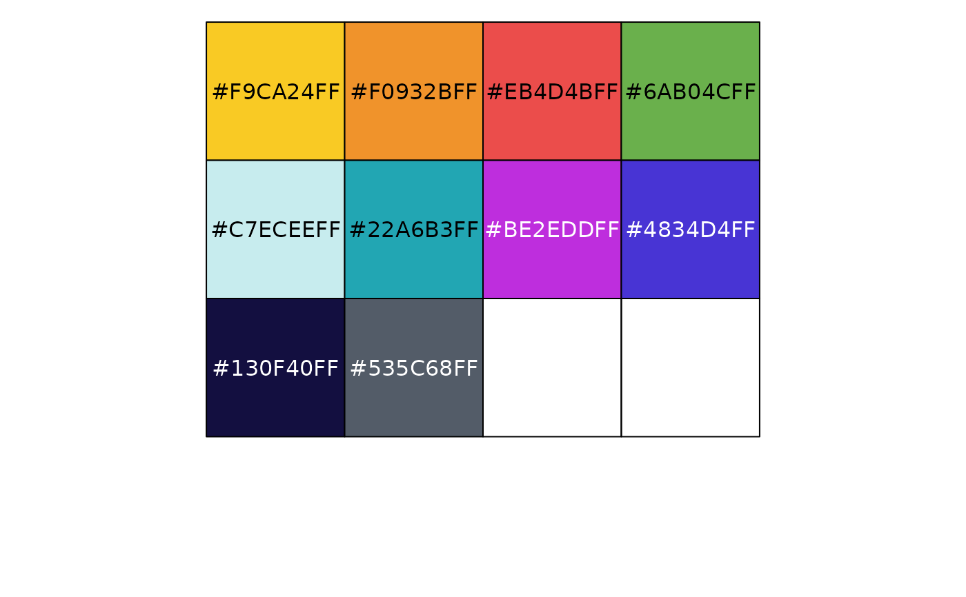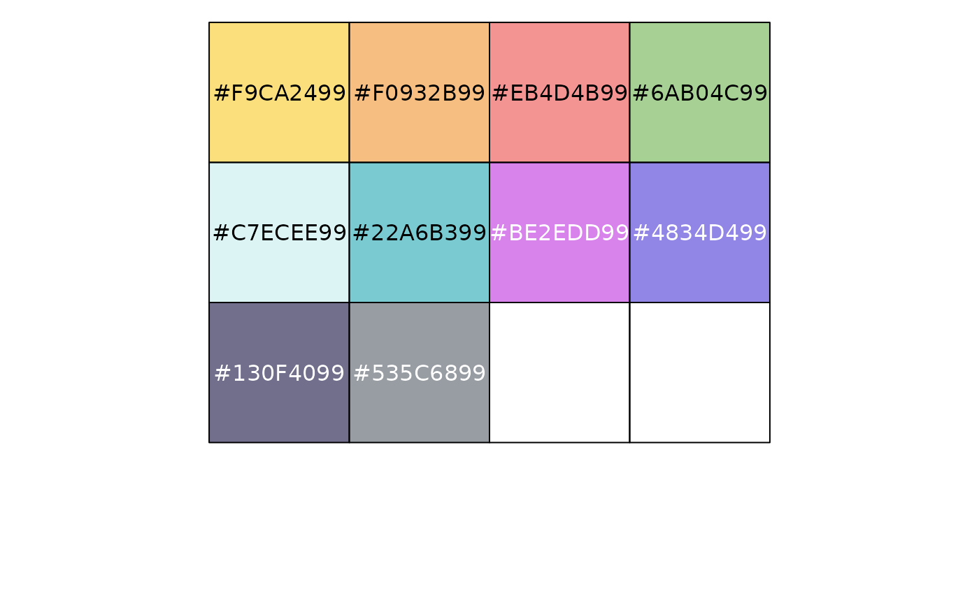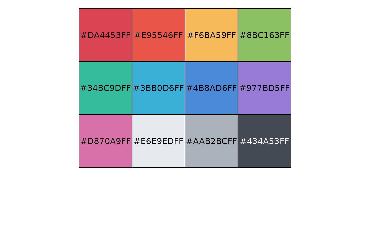 pal_flatui(palette = c("default", "flattastic", "aussie"), alpha = 1)Palette type. Currently there are three available options: