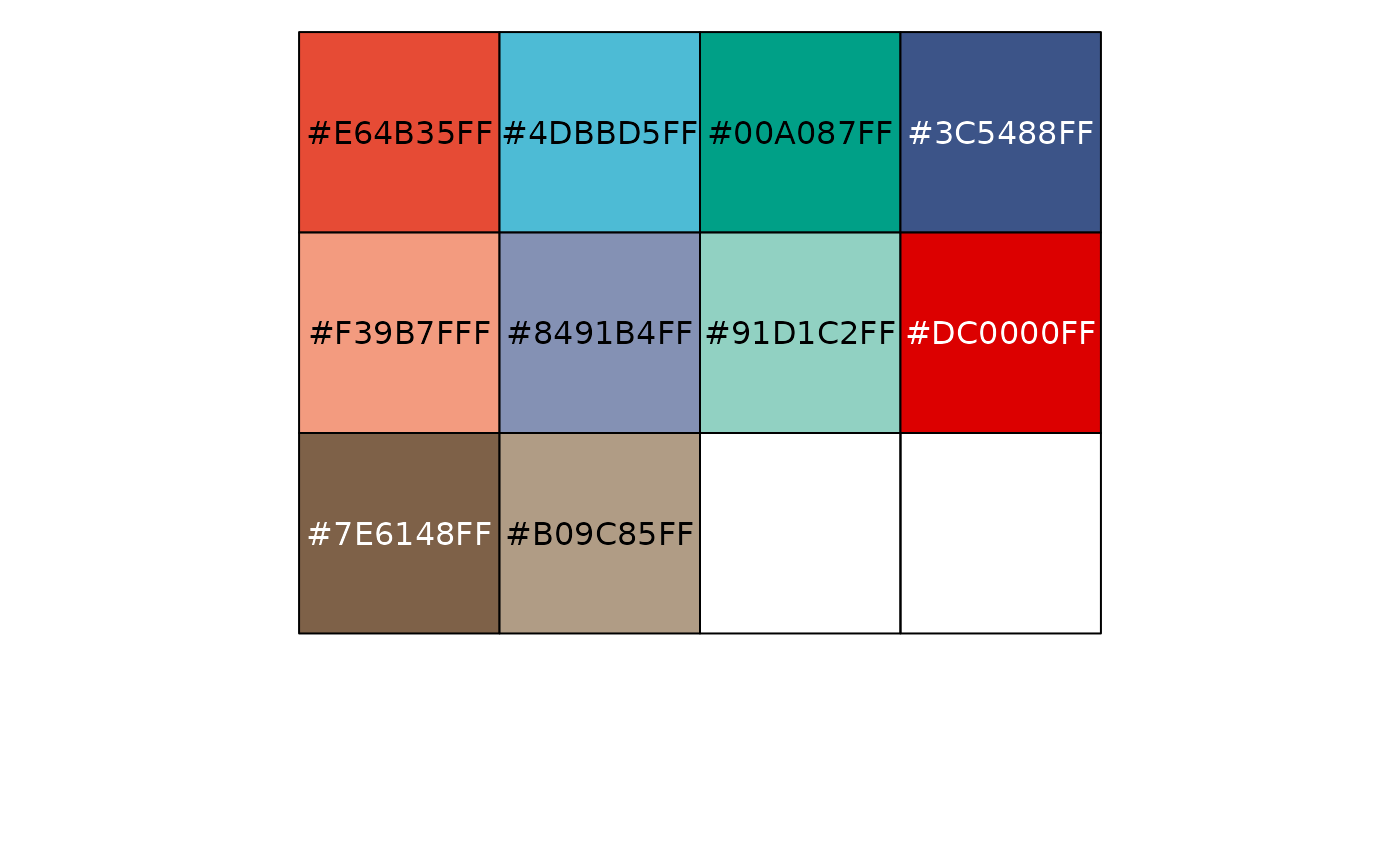 pal_npg(palette = c("nrc"), alpha = 1)Palette type.