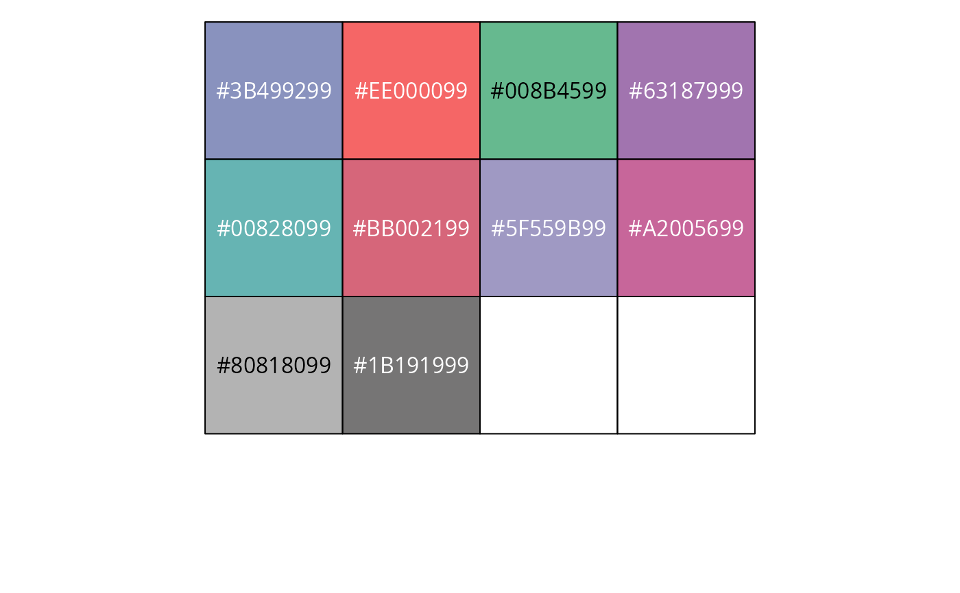 pal_aaas(palette = c("default"), alpha = 1)Palette type.