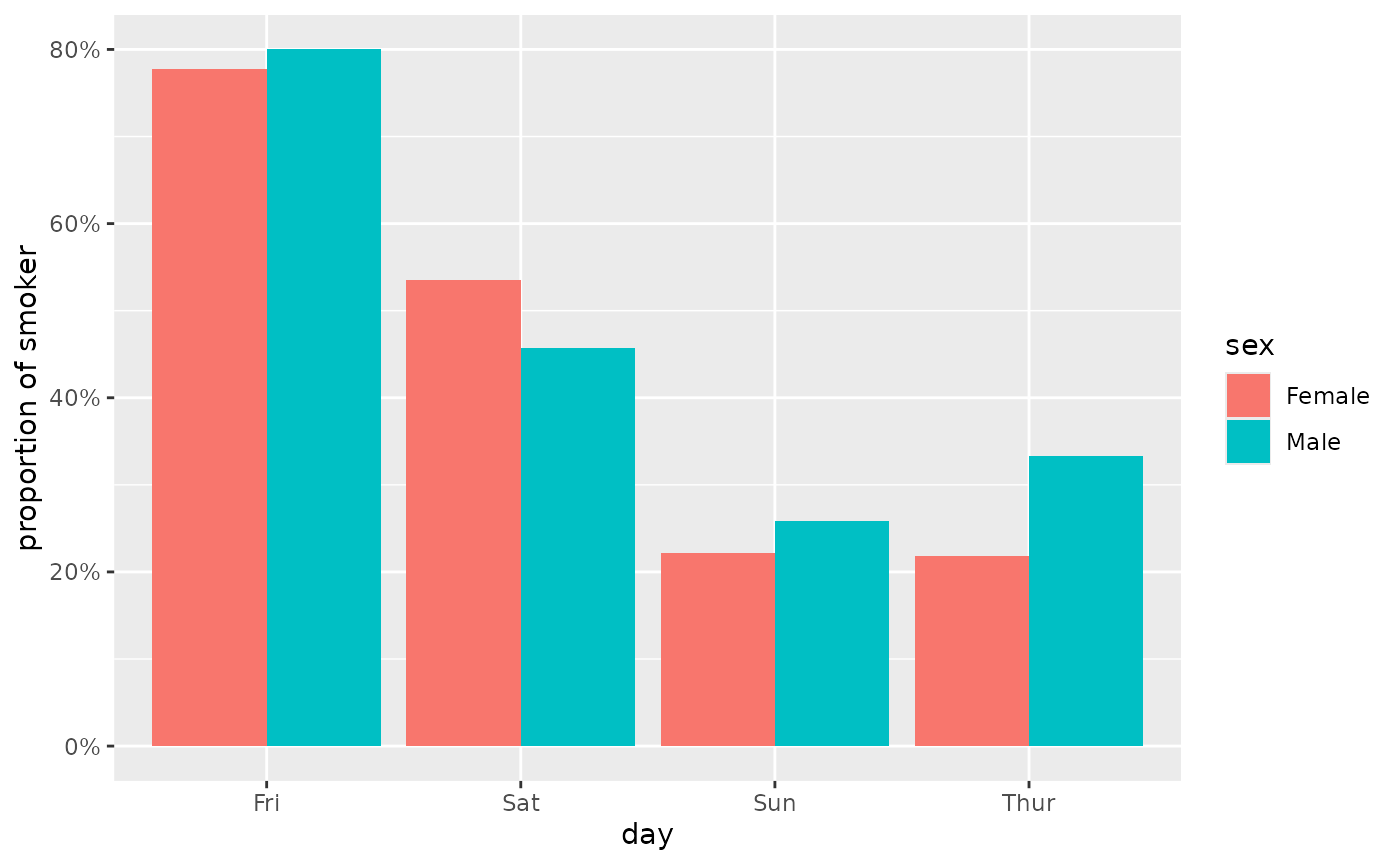 Finally, you can use the weight aesthetic to indicate weights to take into account for computing means / proportions.