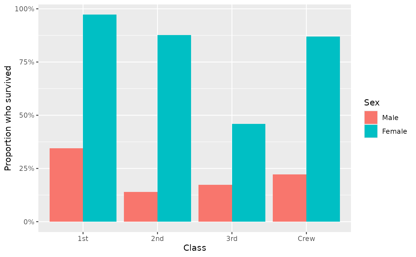 aes(x = Class, y = as.integer(Survived == "Yes"), weight = Freq, fill = Sex) +