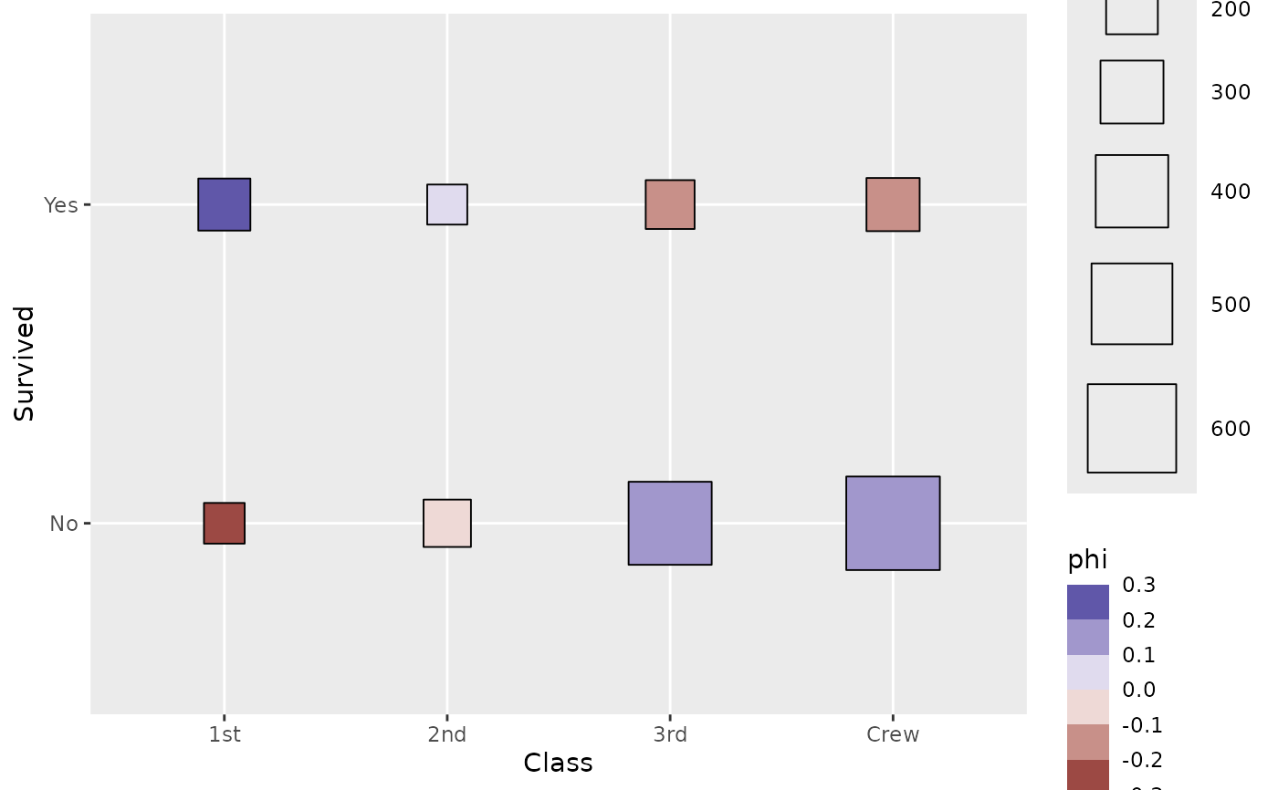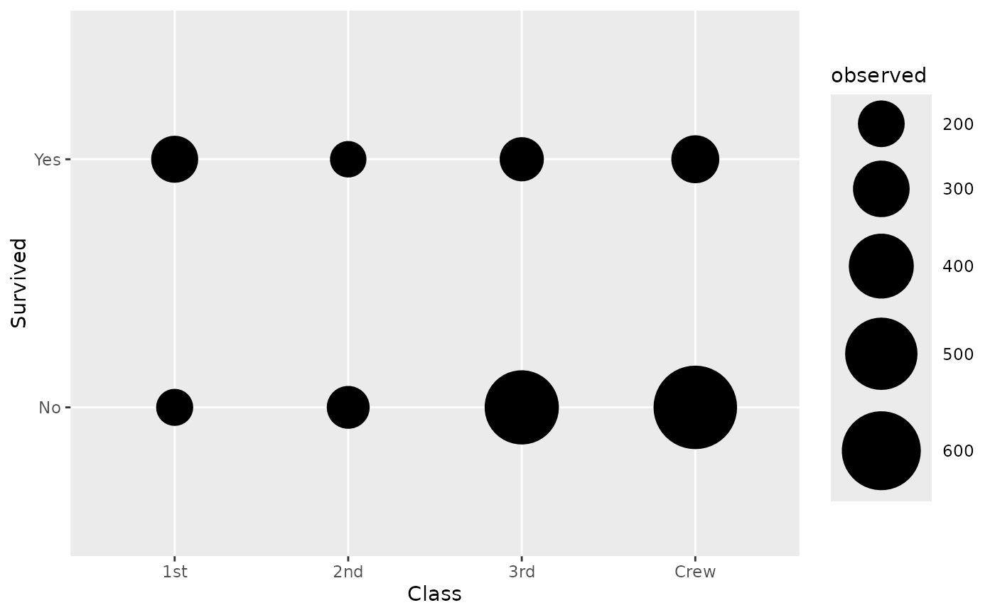 aes(x = Class, y = Survived, weight = Freq, size = after_stat(observed)) +