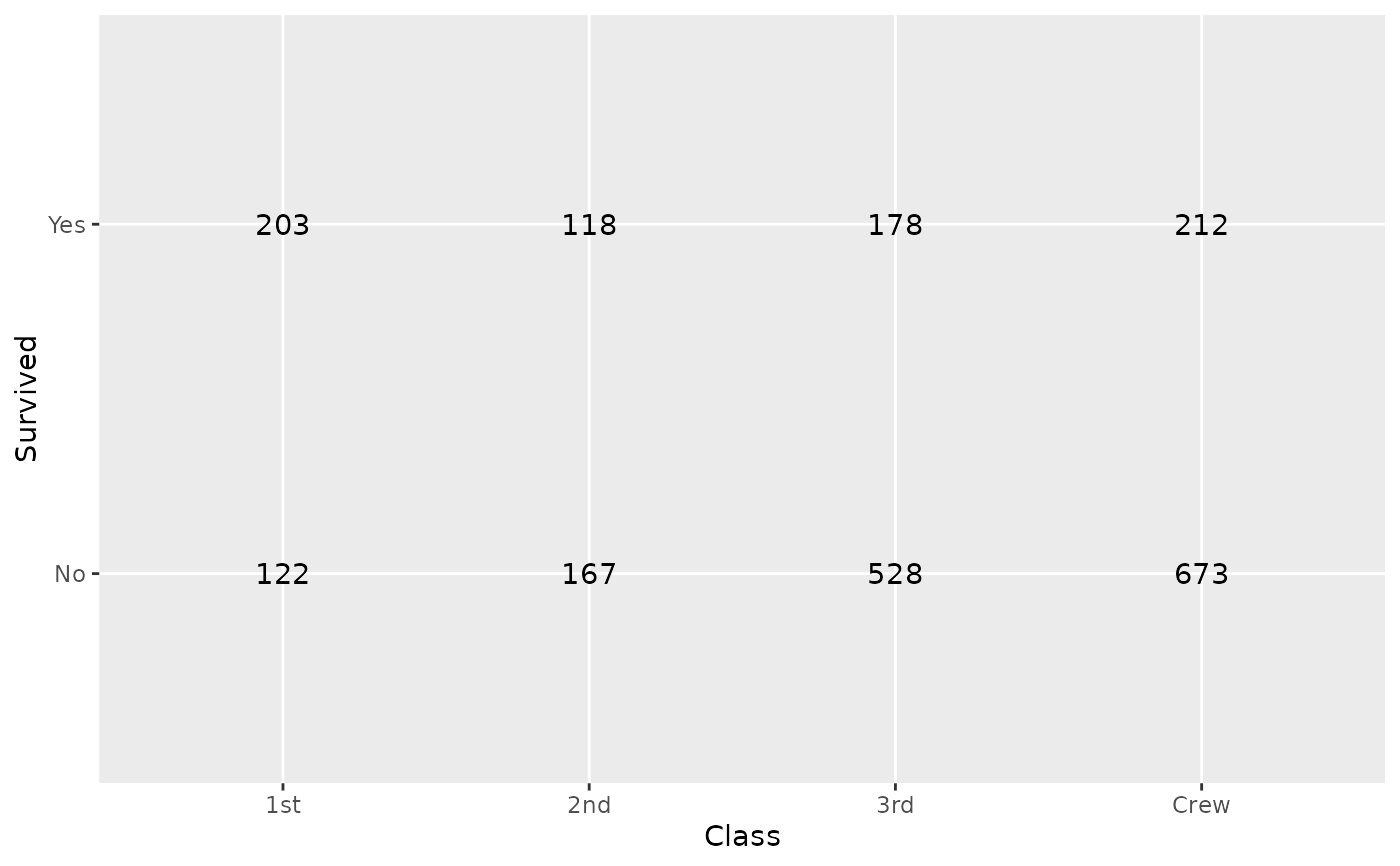 x = Class, y = Survived, weight = Freq, label = after_stat(observed)