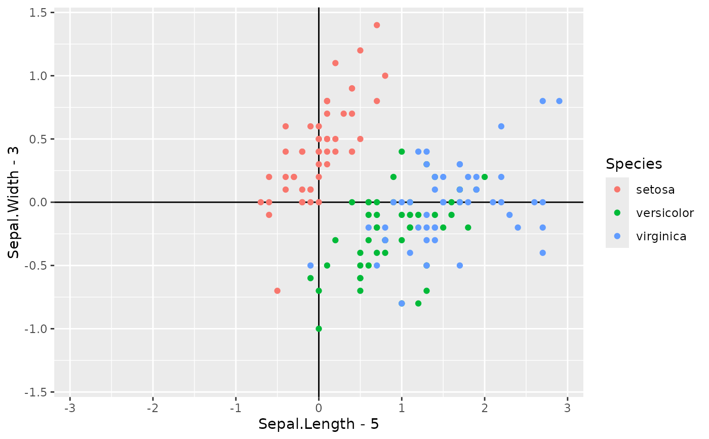 aes(x = Sepal.Length - 5, y = Sepal.Width - 3, colour = Species) +