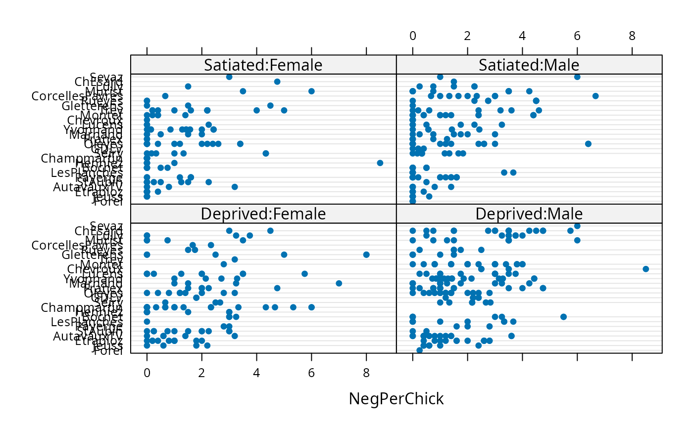 dotplot(reorder(Nest,NegPerChick) ~ NegPerChick| FoodTreatment:SexParent,