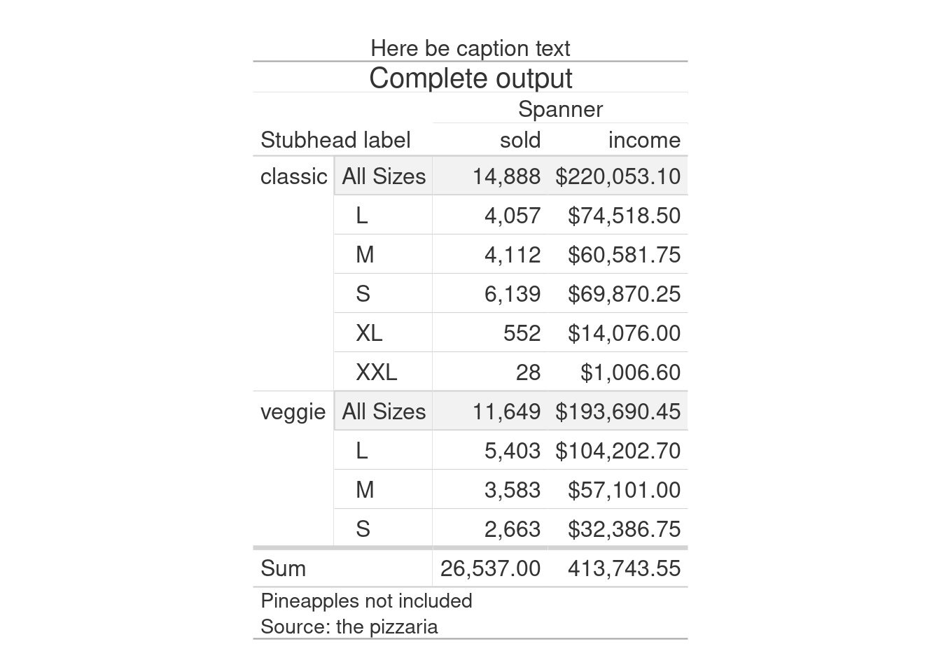 tab_footnote("Pineapples not included")Complete output