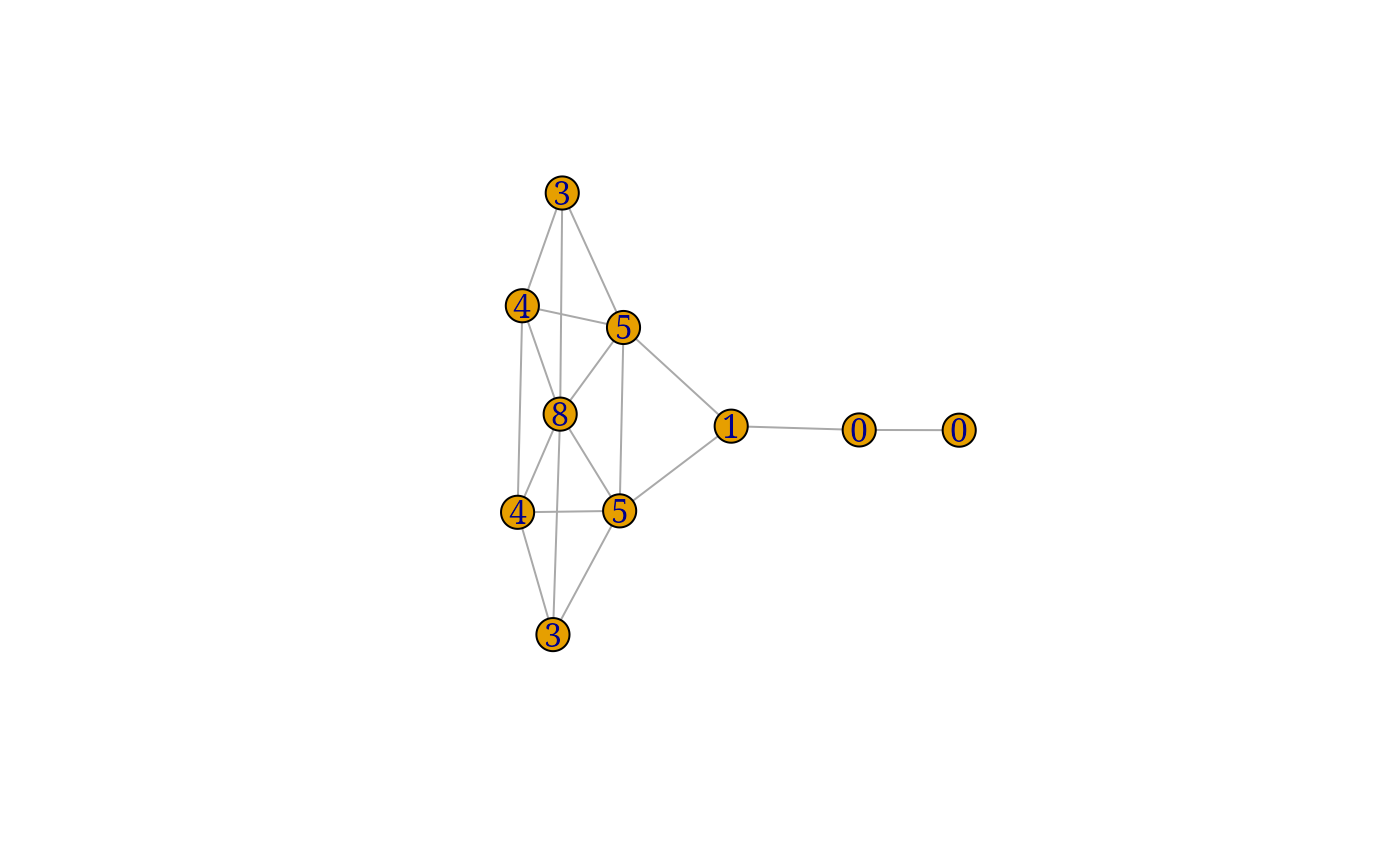 count_triangles(graph, vids = V(graph))For triangles() a numeric vector of vertex ids, the first three