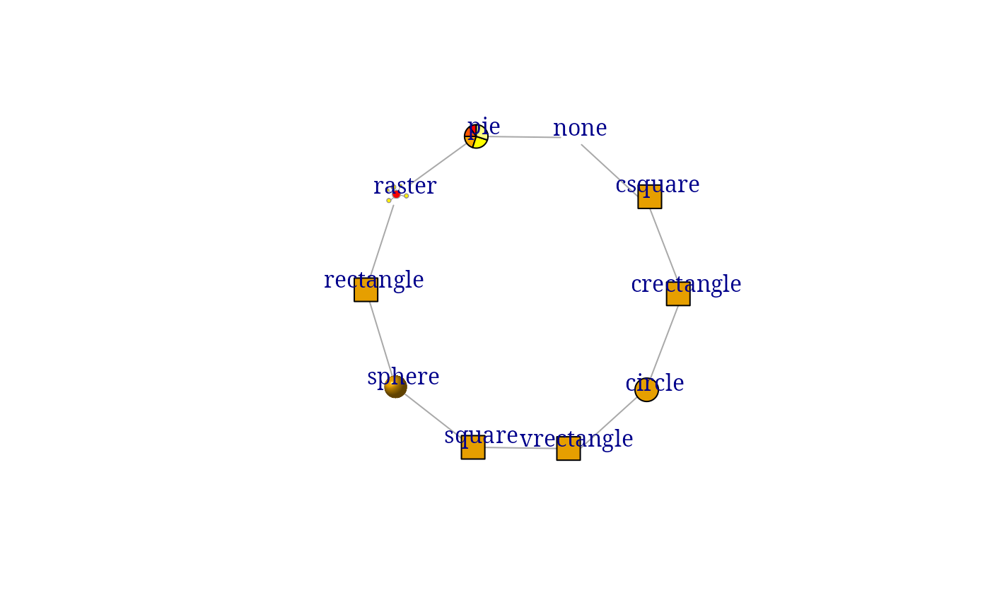 vertex.shape = shapes, vertex.label = shapes, vertex.label.dist = 1,