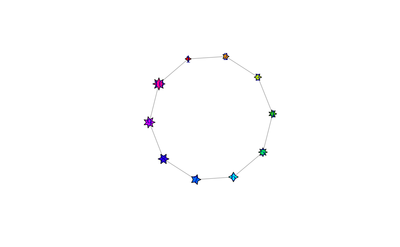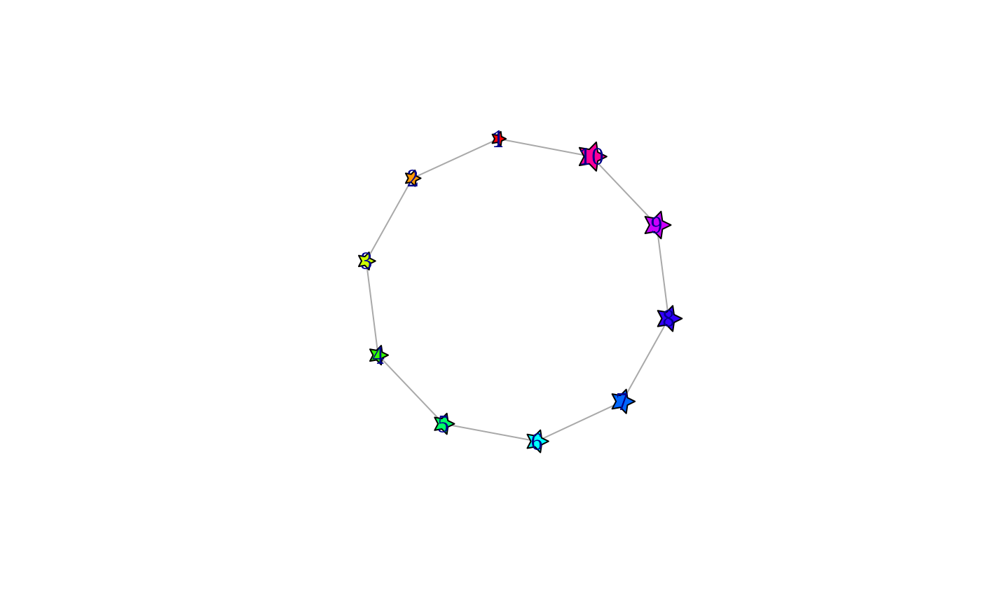 vertex.shape = "star", vertex.color = rainbow(vcount(g)),