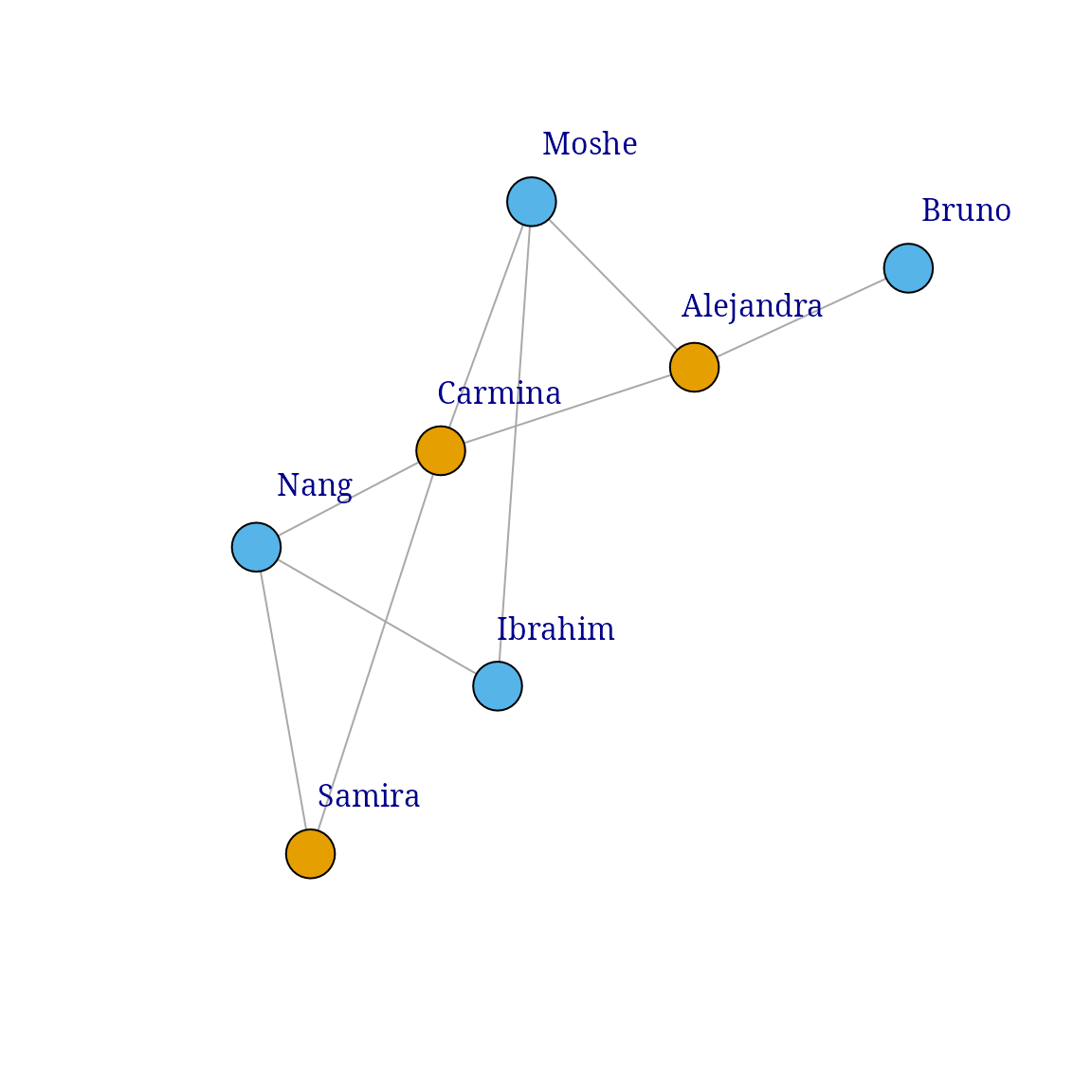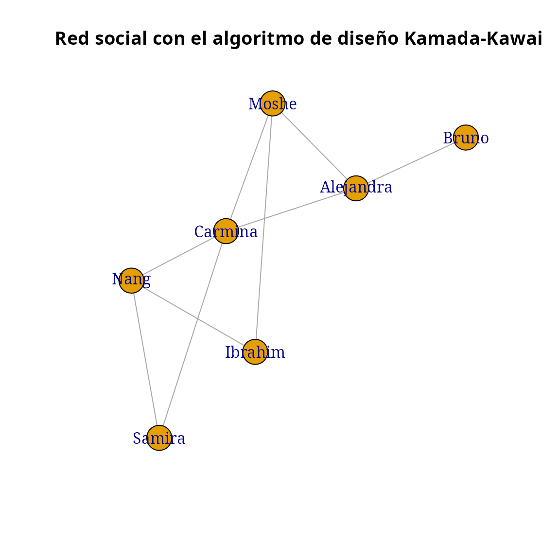 NOTA: La mayoría de los formatos tienen sus propias limitaciones; por ejemplo, no todos pueden almacenar atributos. Tu mejor opción es probablemente GraphML o GML si quieres guardar los grafos de igraph en un formato que pueda ser leído desde un paquete externo y quieres preservar los atributos numéricos y de cadena. Edge list y NCOL también están bien si no tienes atributos (aunque NCOL admite nombres de vértices y pesos de aristas).