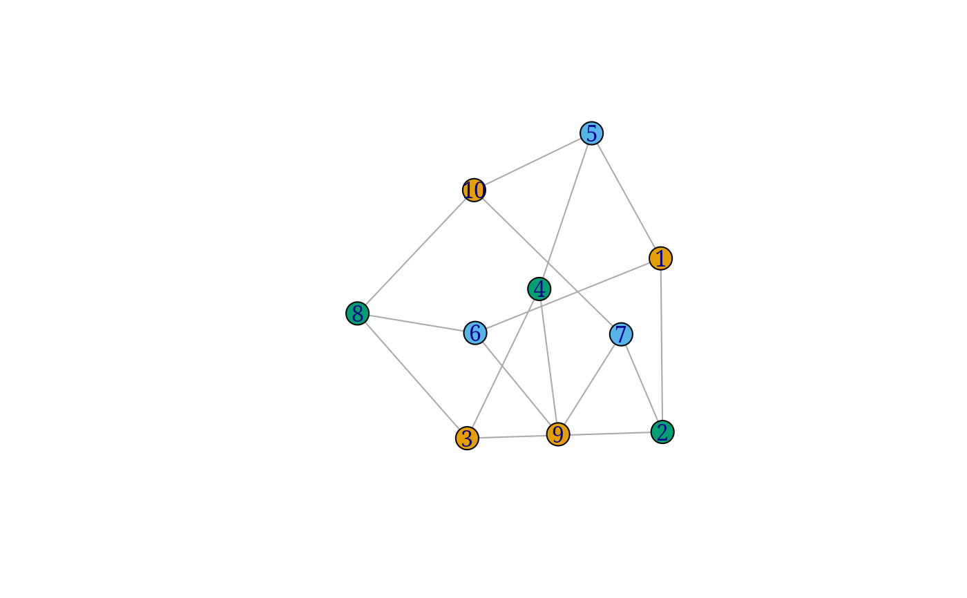 greedy_vertex_coloring(graph, heuristic = c("colored_neighbors", "dsatur"))The graph object to color.