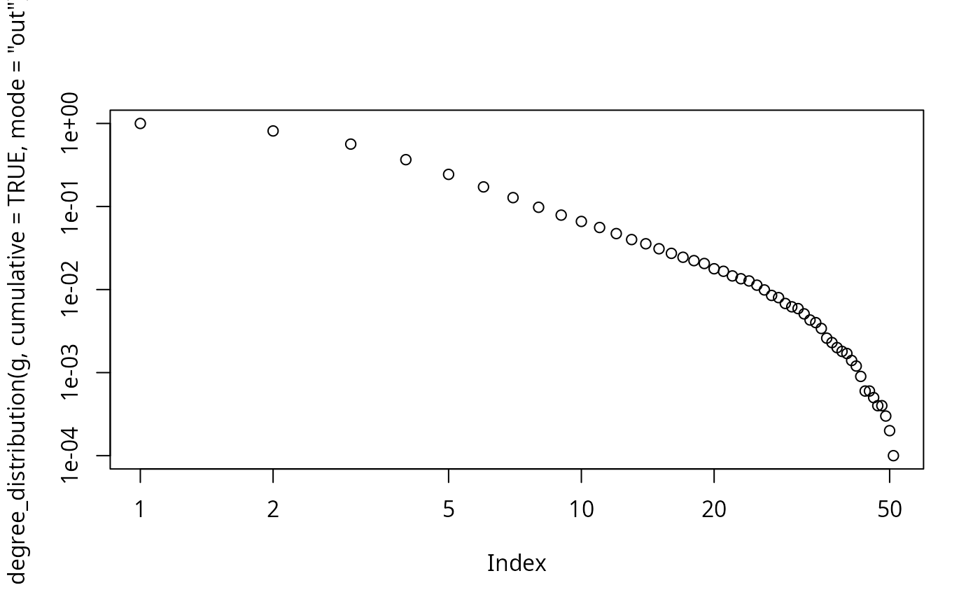 plot(degree_distribution(g, cumulative = TRUE, mode = "out"), log = "xy")