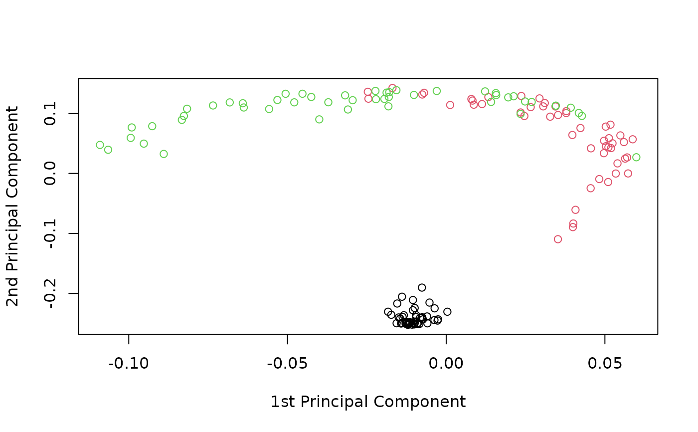 plot(predict(kpc,iris[,-5]),col=as.integer(iris[,5]),