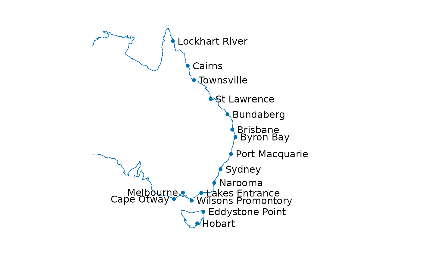 EastAuClimate.RdA set of climate statistics for 16 coastal locations along Eastern Australia. These sites were chosen to be approximately equally spaced to cover the whole eastern coast of Australia. For each site, climate statistics were calculated for the standard 30-year period 1971-2000. Only sites with nearly-complete data were chosen.