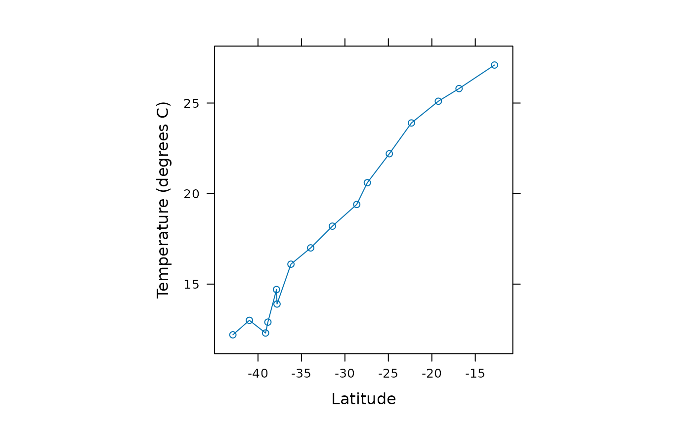 xyplot(WinterMaxTemp ~ Latitude, EastAuClimate, aspect = "xy",