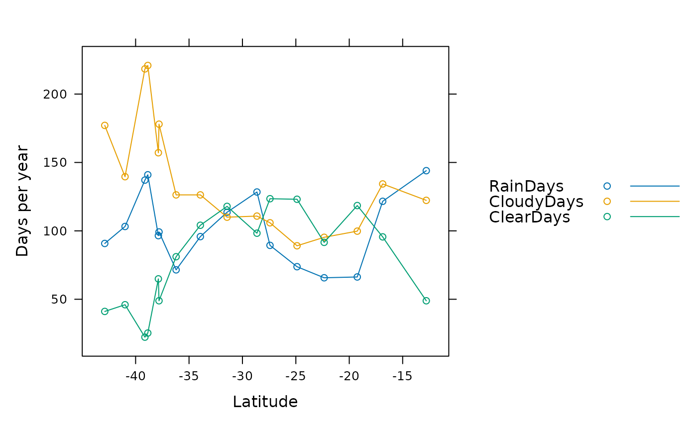 xyplot(RainDays + CloudyDays + ClearDays ~ Latitude, EastAuClimate,