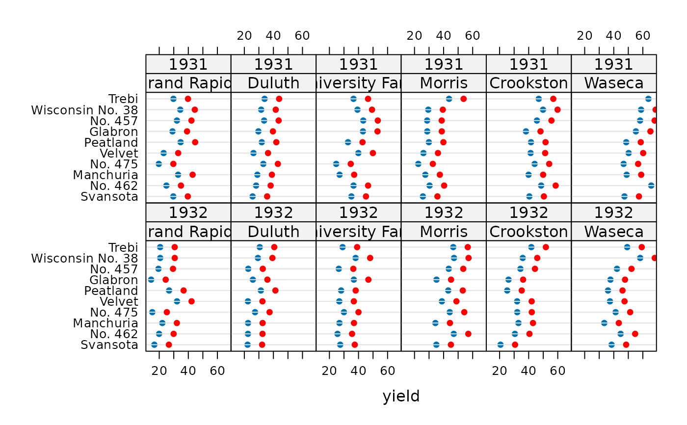 dotplot(variety ~ yield | site * year, data = b1, subscripts = TRUE) +