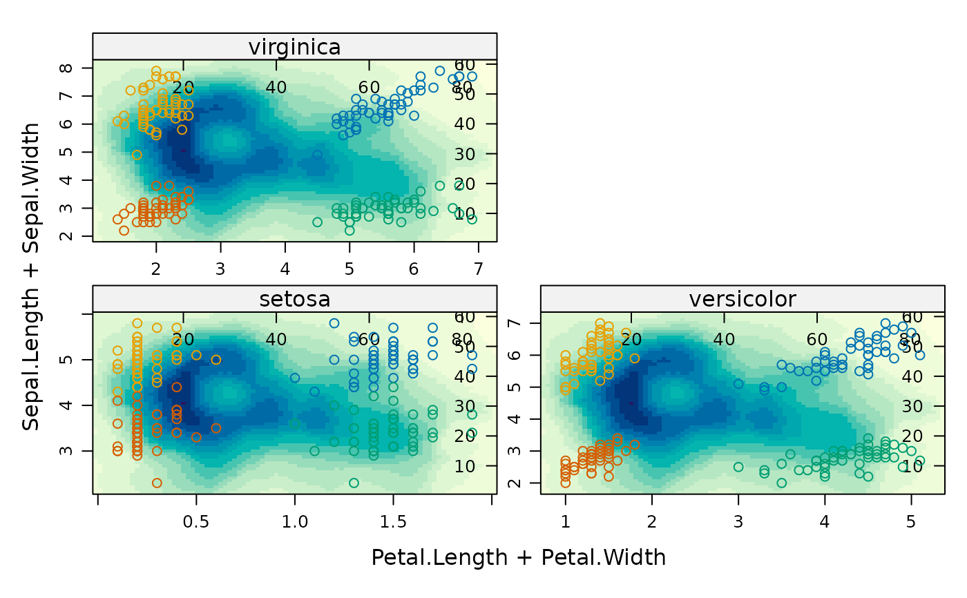 xyplot(Sepal.Length + Sepal.Width ~ Petal.Length + Petal.Width | Species,